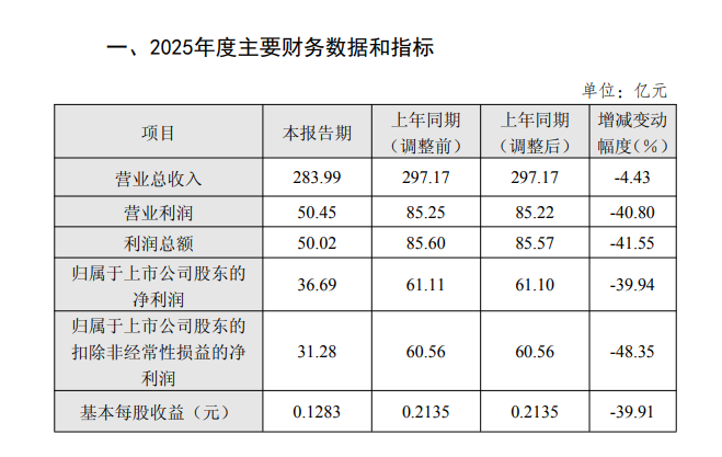 三峡能源(600905.SH)3月31日晚间发布了2025年度业绩快报公告。公告显示,报告期内,公司实现营业总收入283.99亿元,同比减少4.43%;归属于上市公司股东的净利润36.69亿元,同比减少39.94%。