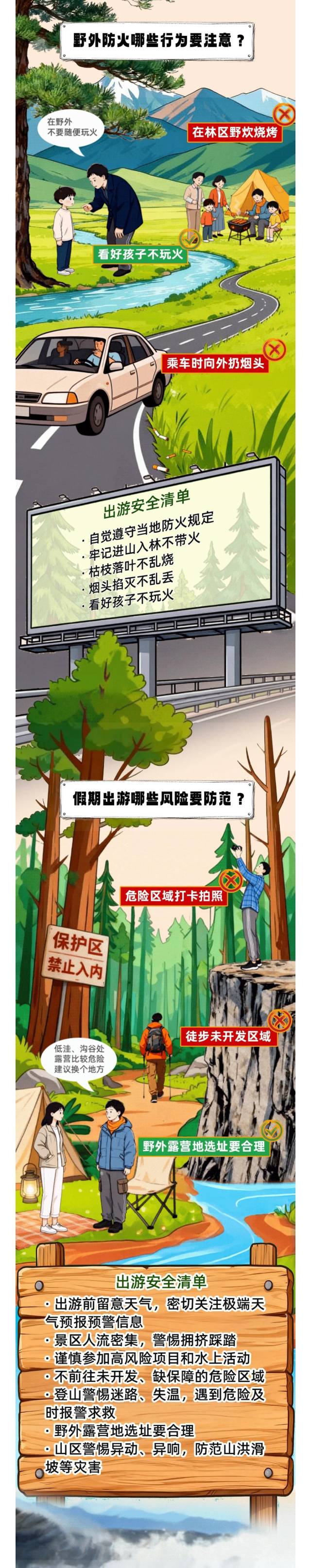出游前留意天气,密切关注极端天气预报预警信息;景区人流密集,警惕拥挤踩踏;谨慎参加高风险项目和水上活动;不前往未开发、缺保障的危险区域;登山警惕迷路、失温,遇到危险及时报警求救;野外露营地选址要合理;山区警惕异动、异响,防范山洪滑坡等灾害。