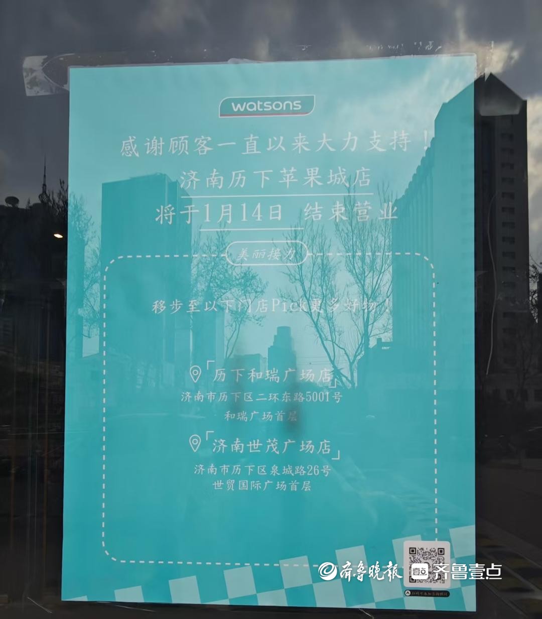 4月1日下午,齐鲁晚报·齐鲁壹点记者走访济南屈臣氏苹果城店发现,该门店已处于关闭状态。门店张贴的公告显示,屈臣氏济南历下苹果城店已于1月14日结束营业。