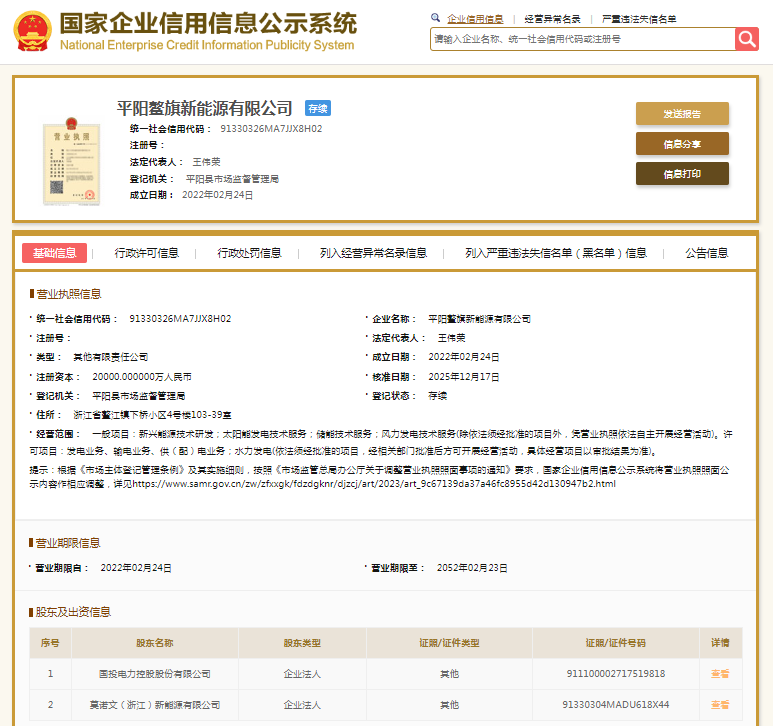 国家企业信用信息公示系统显示,平阳鳌旗新能源有限公司成立于2022年,法定代表人王伟荣,注册资本20000万元人民币,大股东国投电力(600886.SH)持股60%,莫诺文(浙江)新能源有限公司则持股40%。