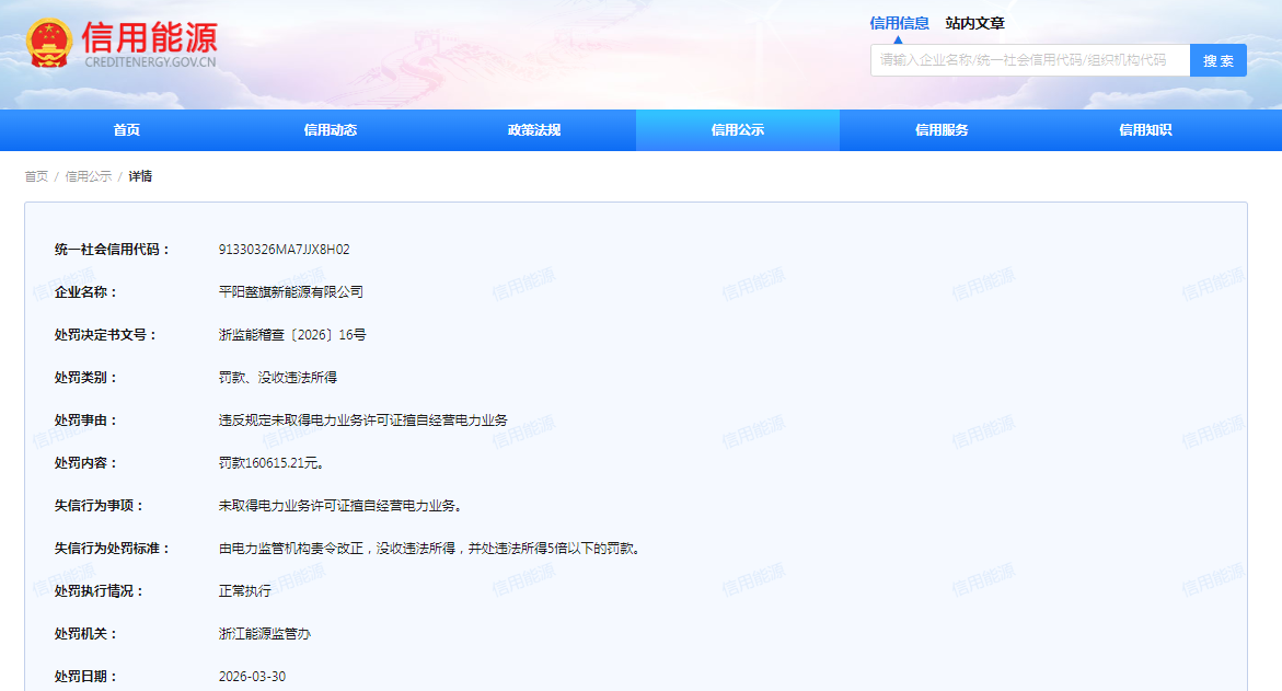 浙监能稽查〔2026〕16号内容显示,鳌旗新能源的被处罚事由为:违反规定未取得电力业务许可证擅自经营电力业务。
