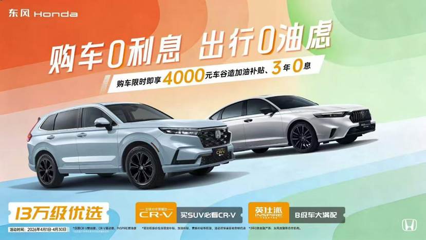 “以用户为中心”始终是东风本田一切工作的原点。从覆盖燃油、混动、插混、纯电的“技术全家桶”,到轿车、SUV、MPV的“全明星阵容”,再到多年来对于品质、安全的坚守,所有努力都指向同一个方向——更好地服务于用户。值得一提的是,这份初心,既体现于产品层面的精益求精,也延伸至购车环节的真情回馈。即日起至4月30日期间,购买CR-V、英仕派的指定车型限时可享4000元车谷造加油补贴及3年0息的金融政策,以真金白银的诚意降低购车门槛,让更多用户轻松拥抱高品质出行生活。