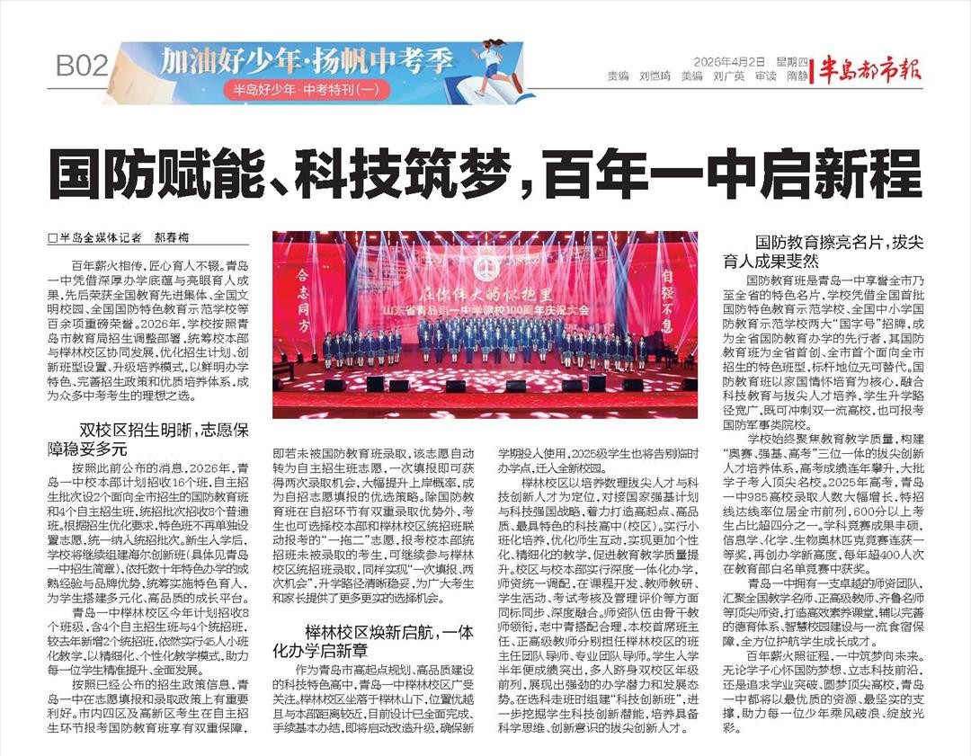 百年薪火照征程,一中筑梦向未来。无论学子心怀国防梦想、立志科技前沿,还是追求学业突破、圆梦顶尖高校,青岛一中都将以最优质的资源、最坚实的支撑,助力每一位少年乘风破浪、绽放光彩。