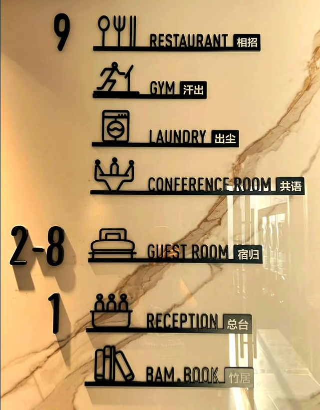 近日,亚朵酒店的中文楼层标识引发热议。餐厅名曰“相招”,洗衣房写作“出尘”,健身房唤作“汗出”……这些取自古典诗文的雅致命名,本意是为空间赋予诗意,却在不少住客那里成了“文字谜题”,甚至出现“看懂中文要靠英文注释”的尴尬局面。
