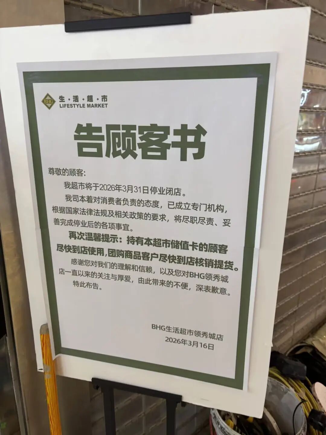 3月31日,经济导报记者实地走访领秀城贵和购物中心看到,地下一层原BHG生活超市已大门紧闭,入口处可见闭店公告。