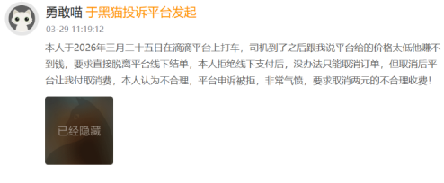 其二,司机违规乱象频发,私下加价、拒载成常态。消费者投诉中,频繁出现司机以“订单价格太低”为由,要求乘客进行线下交易、额外加价的情况。更令人诟病的是,部分乘客拒绝司机的违规要求后,反而被平台判定为“有责取消”,扣除相应取消费,权责倒置的操作让消费者难以接受。