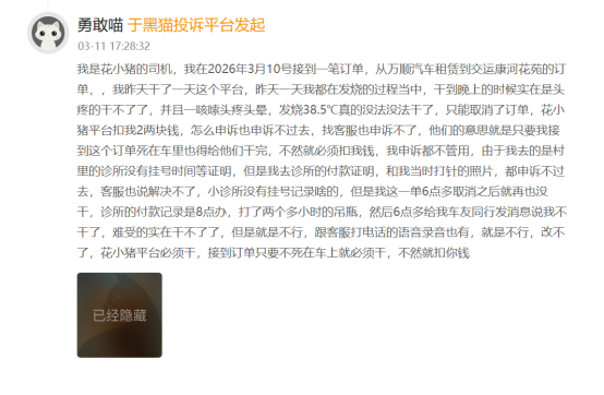 如果说监管数据是冰冷的警示,那么消费者的海量投诉则是最直接的不满宣泄。截至2026年4月1日,黑猫投诉平台上,花小猪的历史投诉量已累计突破10万条,达101256条。梳理这些投诉不难发现,消费者的核心诉求高度集中,主要体现在三大方面,每一项都直指花小猪的服务乱象。