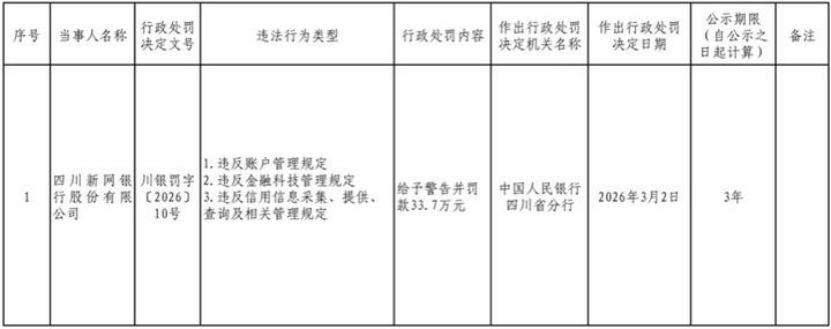 3月中旬,中国人民银行四川省分行行政处罚决定信息公示表显示,新网银行因“违反账户管理规定,违反金融科技管理规定,违反信用信息采集、提供、查询及相关管理规定”等3项违规违法行为,被处罚款33.7万元并给予警告。