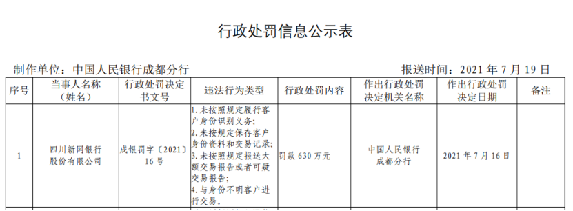 同年7月16日,新网银行迎来开业以来最大罚单。中国人民银行成都分行查明,新网银行存在四项违法违规行为,包括“未按照规定履行客户身份识别义务,未按规定保存客户身份资料和交易记录,未按照规定报送大额交易报告或者可疑交易报告,与身份不明客户进行交易”。针对上述问题,中国人民银行成都分行对新网银行罚款630万元,同时对时任副行长刘波等4名责任人合计罚款23.5万元。