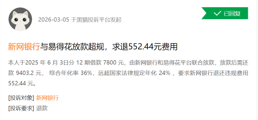 平台投诉内容主要集中在催收方式、利率收费、合同条款、放款资质等方面。有投诉者反映,其在与新网银行相关的借贷业务中遭遇暴力催收、高额利息、不合理收费等问题;也有用户表示,部分第三方平台以新网银行为放款方开展业务,但在实际操作中存在信息不透明、费率不清晰等情况,且部分平台并不在新网银行公开合作名单内,引发消费者对合作合规性与资金安全性的质疑。