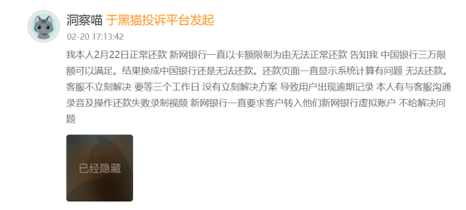此外,系统故障导致的还款难题、协商还款被拒等问题也频繁出现。有用户投诉称,新网银行以卡额限制、系统计算异常为由,导致用户无法正常还款,客服未及时解决问题,致使用户面临逾期风险;还有用户因资金周转困难申请延期还款,多次与新网银行协商均被拒绝,希望平台督促达成个性化分期方案。