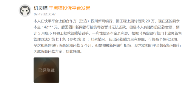 具体来看,催收问题成为投诉重灾区。“友爱喵”2月21日在平台投诉称,因家庭变故导致借款逾期,新网银行催收人员态度恶劣,以联系非紧急联系人的父母进行威胁恐吓,且APP内无法查看借款合同,要求停催并出示合同。另有用户反映,合作平台存在恶意催收行为,频繁拨打联系人电话,态度强硬,严重影响个人生活。