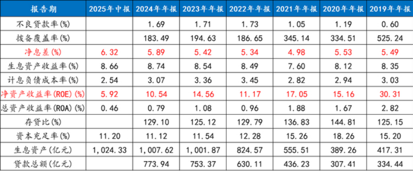 通过企业预警通拉取其2019年到2025年半年度的数据,净息差除2021年为4.98%外,其他几年基本均在5.3%以上,2025年上半年还逆势上升至6.32%,远高于行业均值,2025年四季度末商业银行净息差1.42%,民营银行平均3.83%。