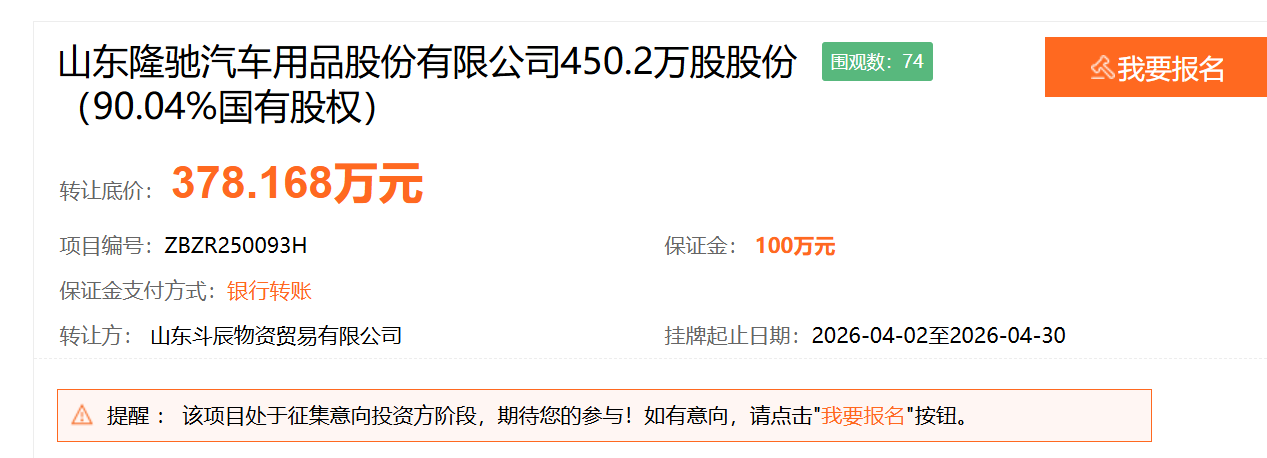 4月2日,山东隆驰汽车用品股份有限公司(下称“山东隆驰”,873056.NQ)两名股东,在山东产权交易中心同步挂牌转让所持公司全部股权。其中,山东王晁煤电集团热电有限公司(下称“王晁煤电”)转让9.96%的股权,转让底价41.83万元;山东斗辰物资贸易有限公司(下称“山东斗辰”)转让90.04%的股权,转让底价378.17万元。