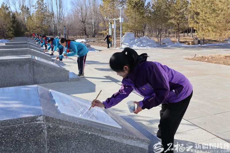 3月25日,托里县第一小学教育集团学生为烈士碑文描红。乔志云摄