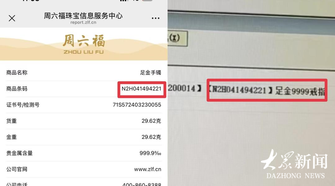 4月1日,孙先生还发现了一件蹊跷事:他在金店的消费记录显示购买的是“足金9999戒指”,但他登录周六福珠宝信息服务中心查询后发现,商品名称显示的却是29.62克的“足金手镯”,两条记录的商品条码均为“N2H041494221”。