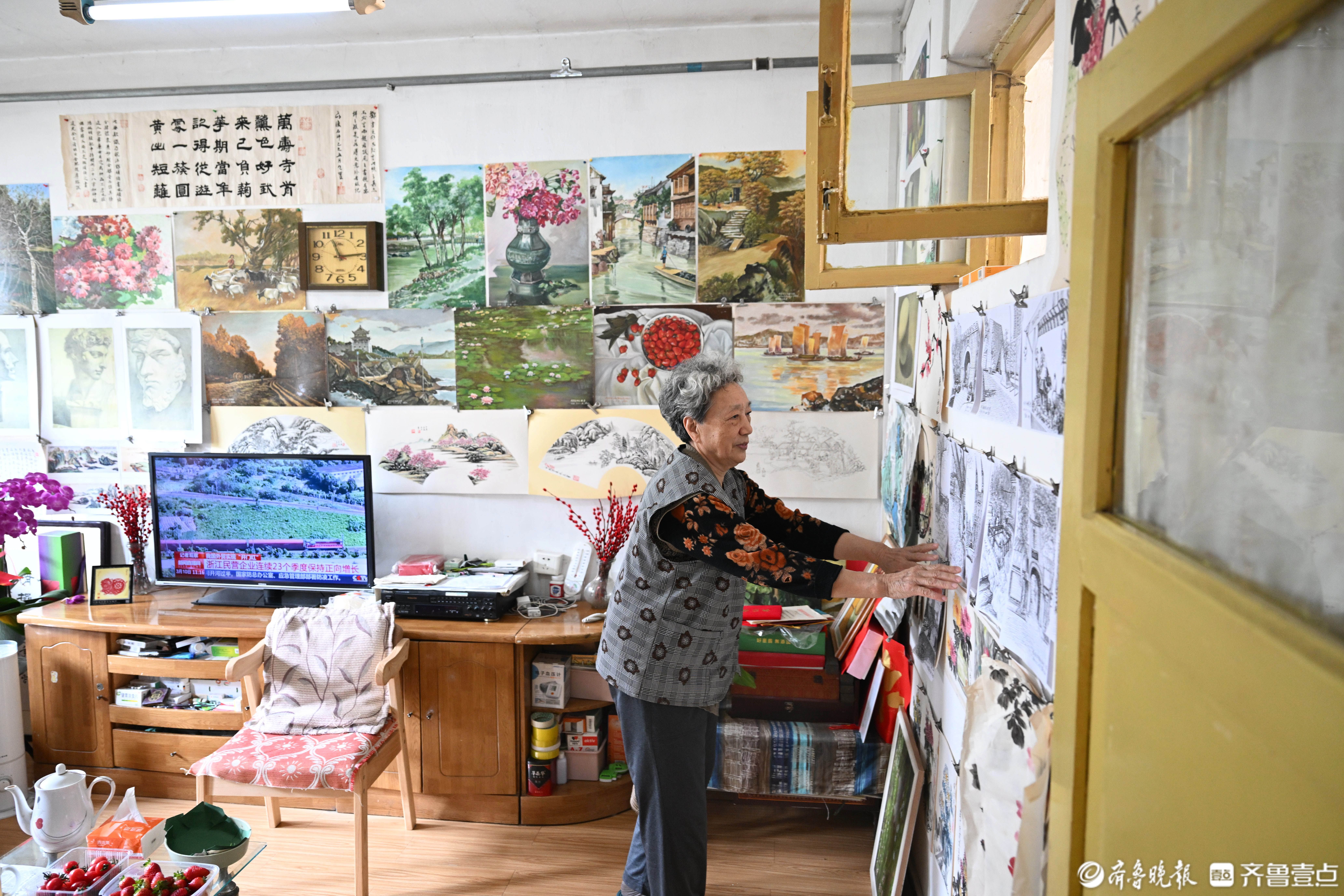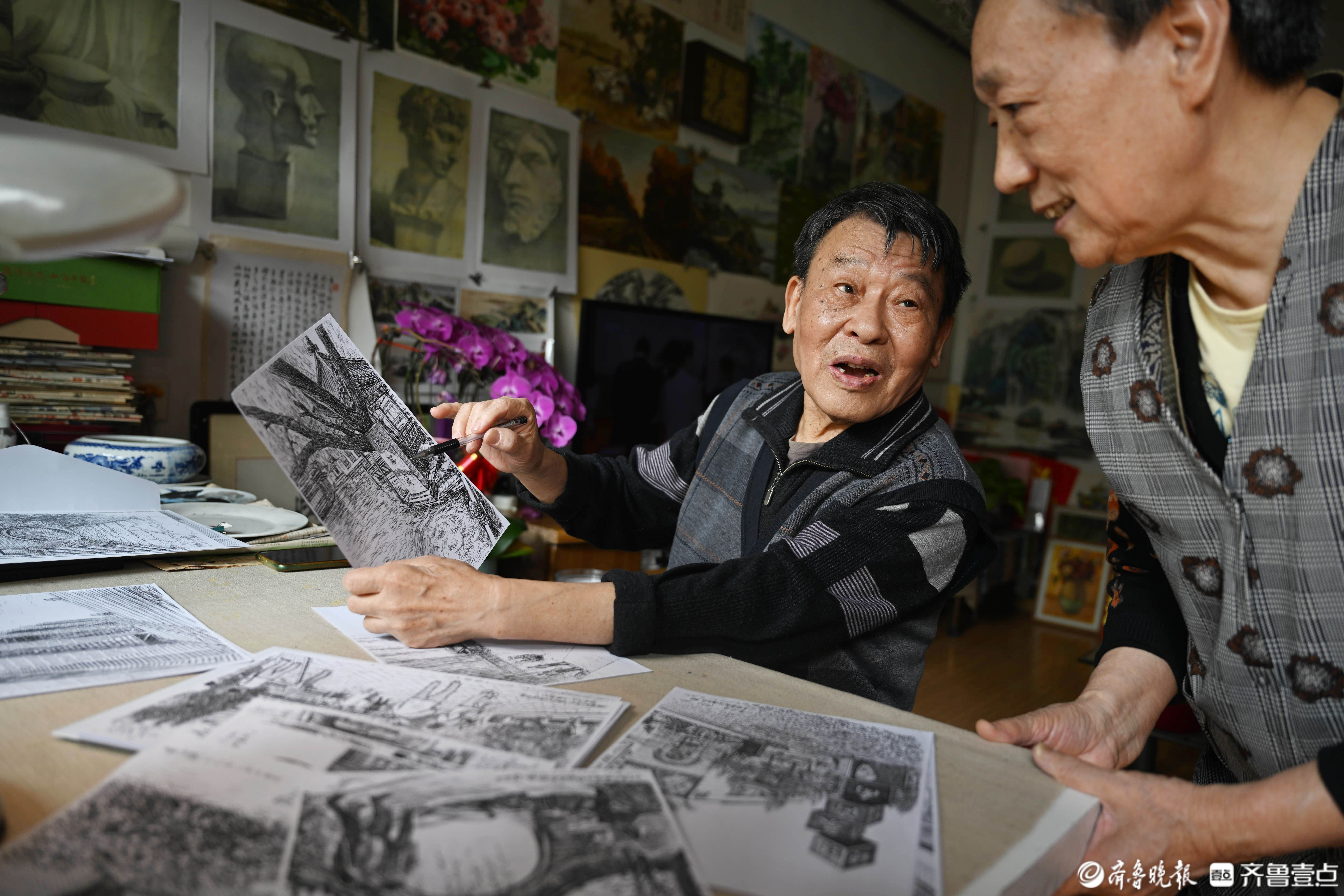 家住济南槐荫区营市东街的陈永立伏案窗前,用手中的中性笔一笔一画地勾勒着线条。“先找好透视关系,再打好草稿……”很快,一栋建筑物的雏形就在纸上凸显出来。在他身后的三面墙上,贴满了他创作的大大小小的画作。有油画有国画,更多的是钢笔画,层层叠叠地挂着,颇为壮观。