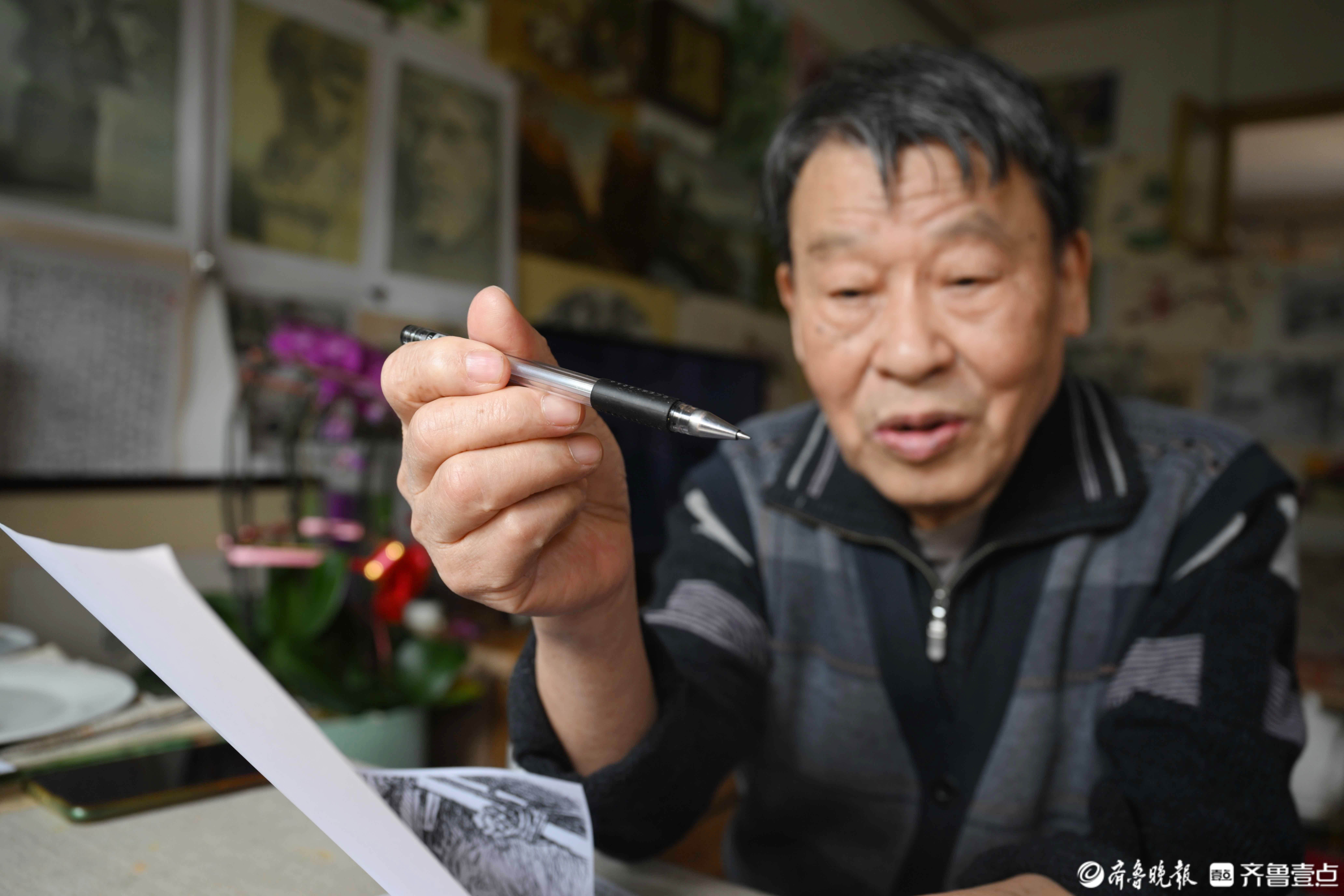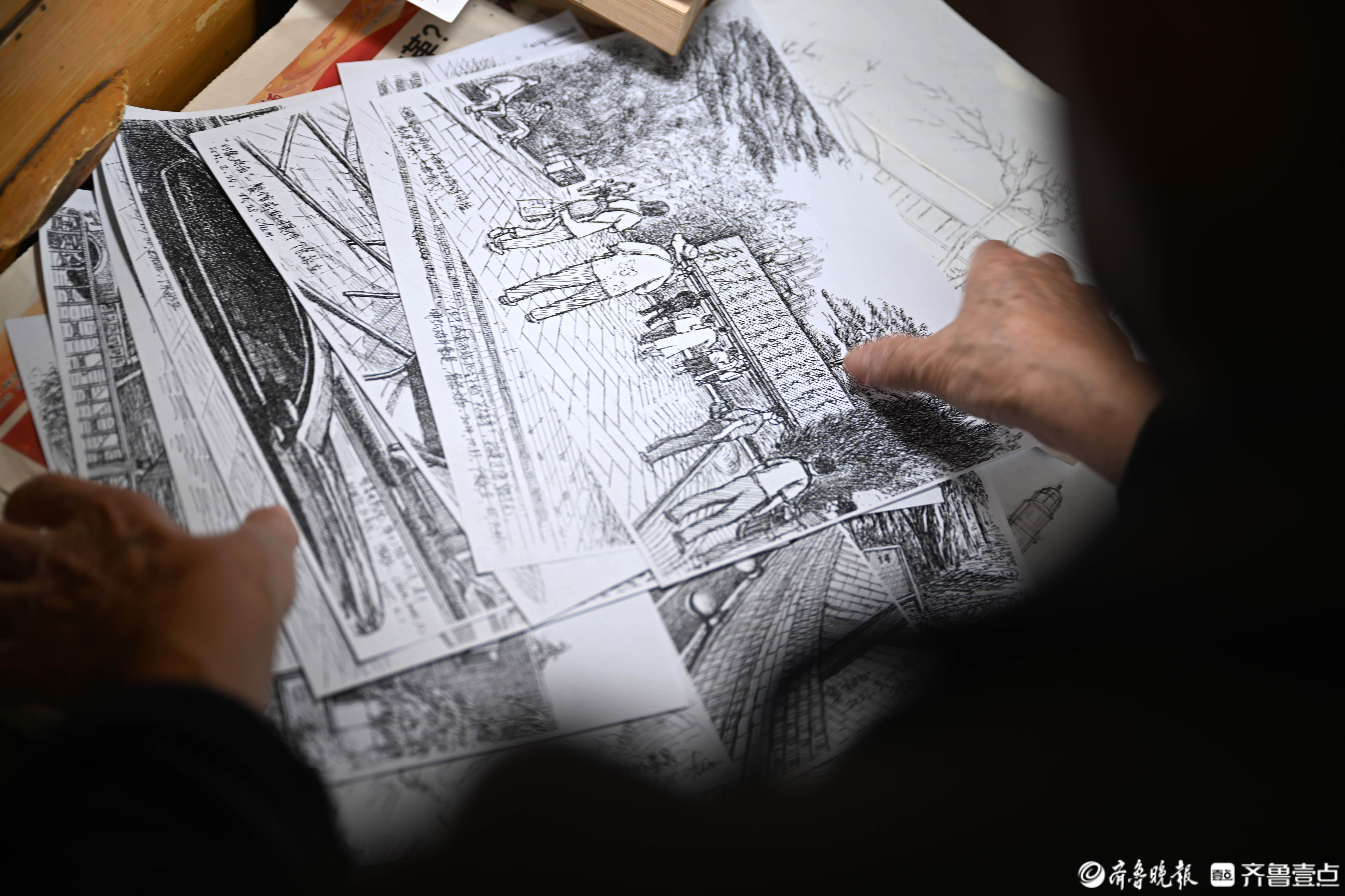 在槐荫区文化馆,陈永立老人正在讲述他的钢笔画背后的故事。