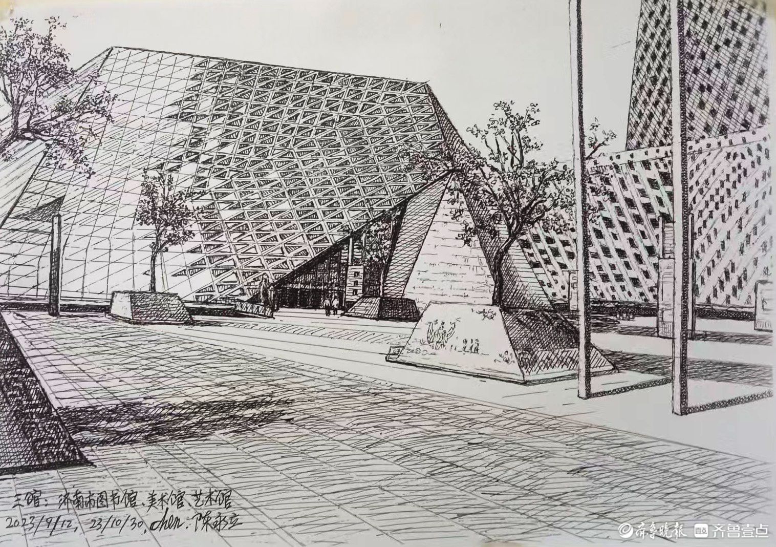 渐渐的,他的画走出了槐荫区,范围扩大到了整个济南。在他的画笔下,有大明湖百脉泉,有奥体中心老商埠,也有新建的地铁……这些年来,他的钢笔画几乎见证了城市发展和变迁。今年元旦期间,槐荫区文化馆邀请他为“城市策展人”,为他举办了一次个人画展,共展出了他的99幅钢笔画,展览目前还在展出中。