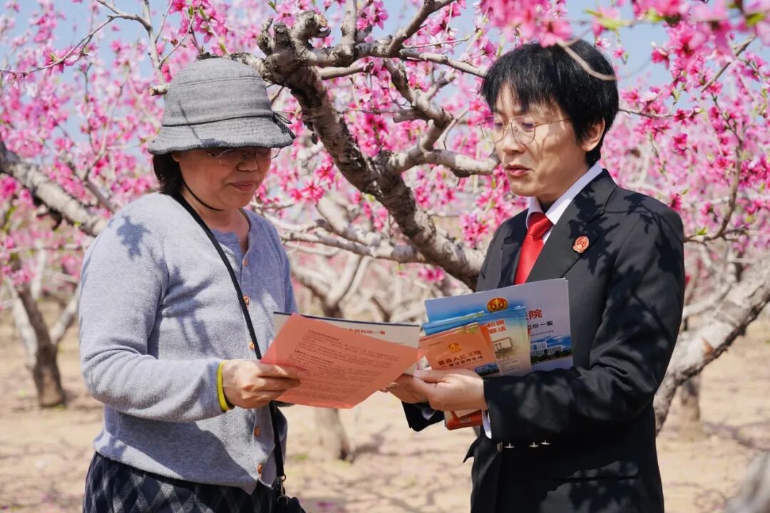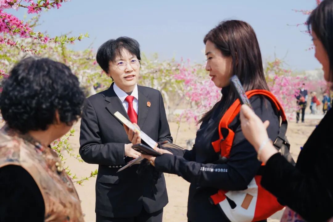 3月31日,曹县梨园艺赏活动在春日暖阳中盛大开幕,现场游人如织、繁花似锦,为进一步将法治理念融入群众休闲生活,青堌集法庭干警走进活动现场,开展特色普法宣传活动,让法治之花与梨花、桃花竞相绽放。