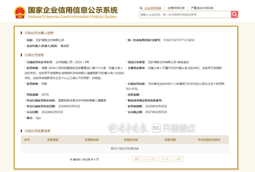 近日,国家税务总局兰州市税务局第二稽查局发布行政处罚决定书(兰市税稽二罚﹝2026﹞4号),五矿钢铁兰州有限公司因未履行个人所得税代扣代缴义务,被处以罚款363.43元。