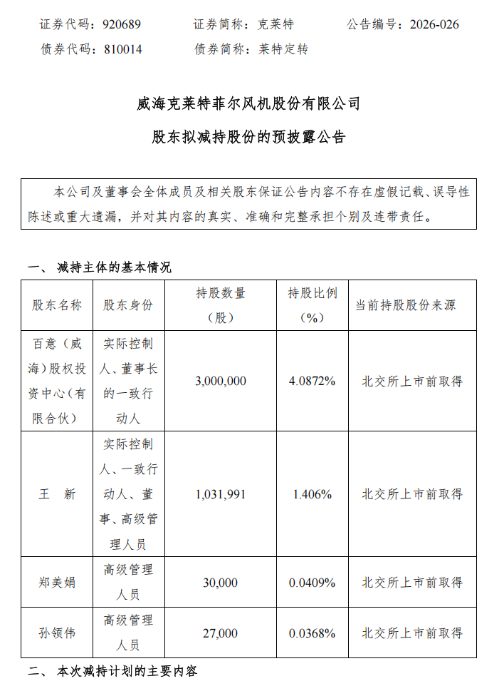 值得注意的是,百意威海为克莱特实际控制人、董事长的一致行动人,王新为实际控制人、一致行动人、董事、高级管理人员,两者合计拟减持不超过99.20万股,占公司总股本1.35%,占本次拟减持总股份数量的98.59%,是本次减持的绝对核心主体。