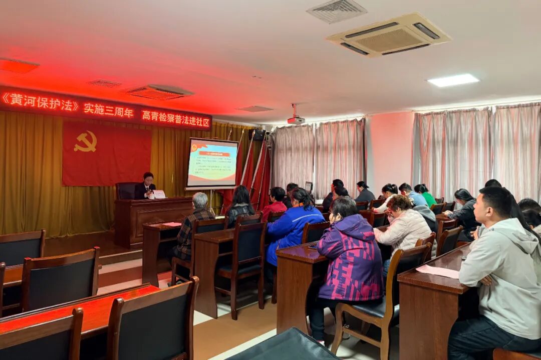 检察干警走进田镇街道官庄社区,开展黄河保护专题普法讲座。干警围绕黄河保护法实施三周年的重要意义、社区居民身边的黄河保护相关法律知识、生态保护公益诉讼等内容进行讲解,结合社区生活实际,普及节约用水、爱护河道、举报生态破坏线索等知识,引导社区群众主动参与黄河保护,让法治理念深入基层、融入日常。
