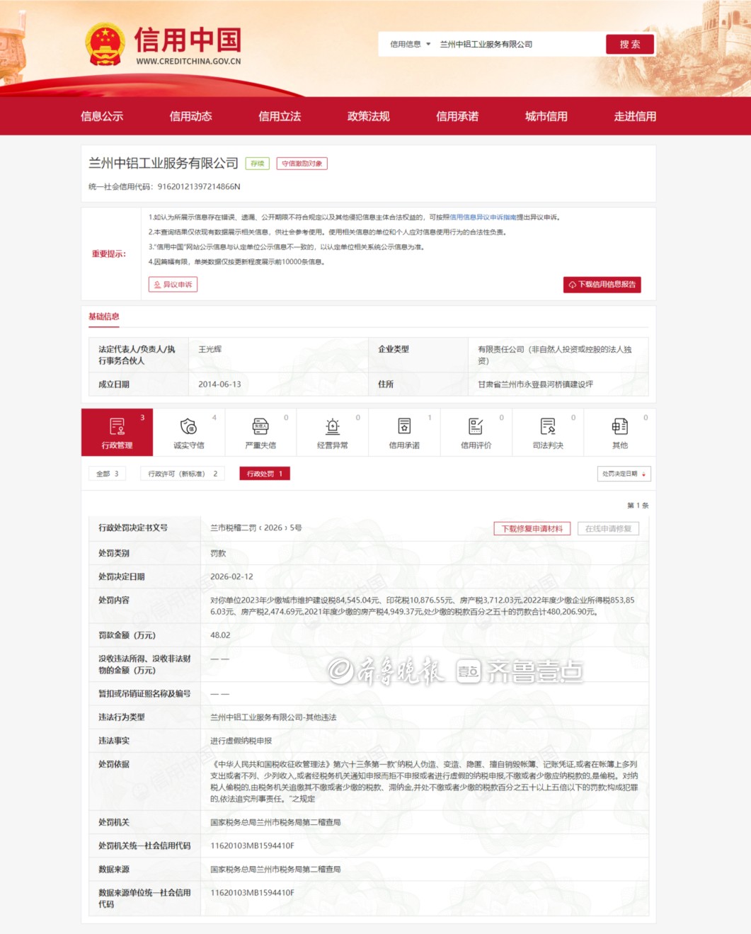 近日,国家税务总局兰州市税务局第二稽查局发布行政处罚决定书(兰市税稽二罚﹝2026﹞5号),兰州中铝工业服务有限公司因进行虚假纳税申报,构成偷税行为,被处以罚款合计48.02万元。