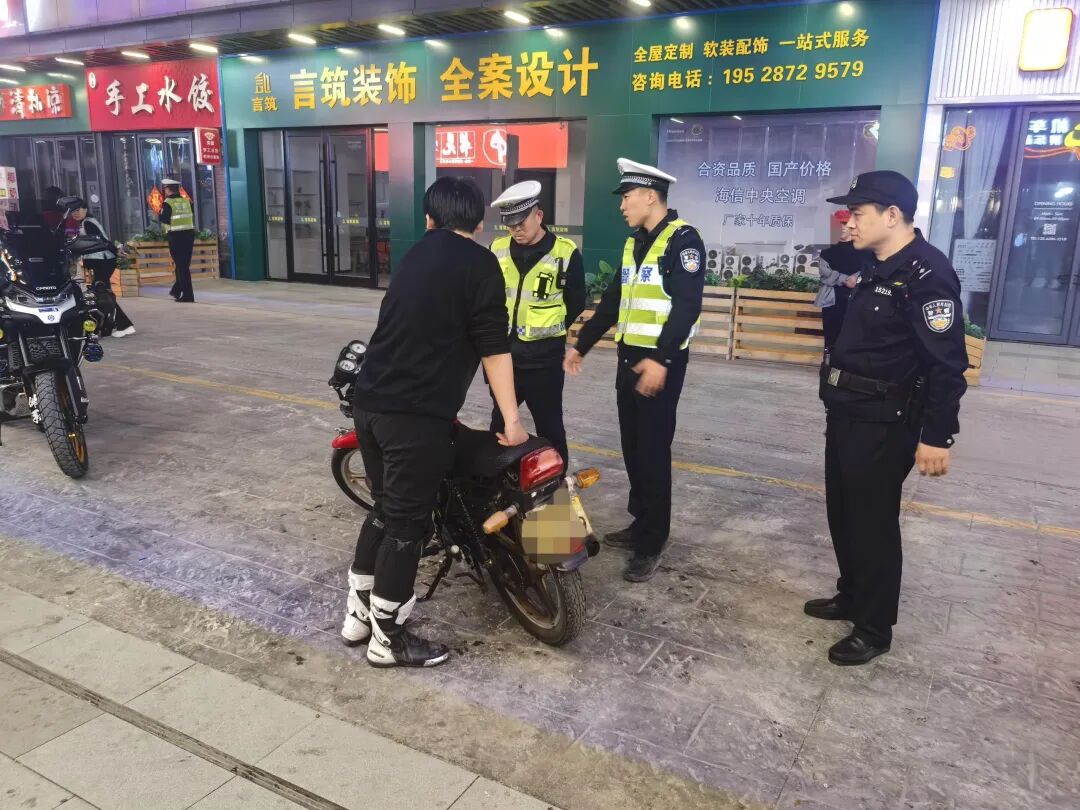 3月25日,滨城执勤民警在巡逻中发现两名未成年人驾驶无牌无证、非法改装电动摩托车,有在道路上“翘头”等危险驾驶行为。随后,民警在某小区将二人抓获,依法对两名违法人员处以罚款400元,并扣留非法改装电动摩托车。