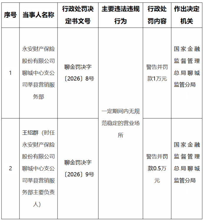 3月30日,国家金融监督管理总局山东监管局官网公示的行政处罚决定书显示,永安财产保险股份有限公司聊城中心支公司莘县营销服务部因一定期间内无规范稳定的营业场所被警告并罚款1万元。同时,王绍群(时任永安财产保险股份有限公司聊城中心支公司莘县营销服务部主要负责人)被警告并罚款0.5万元。