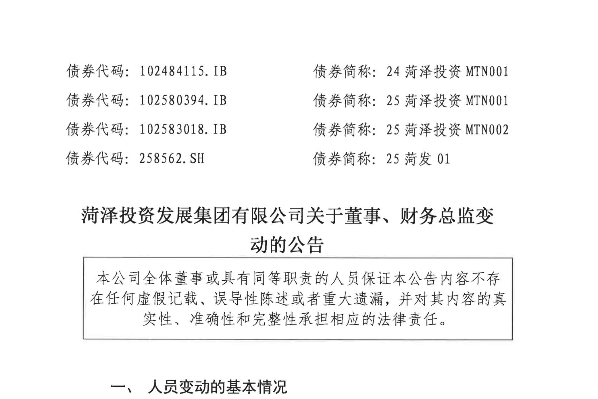 4月1日,菏泽投资发展集团有限公司(下称“菏泽投资发展集团”)发布关于董事、财务总监变动的公告。公告披露,根据公司股东菏泽市国资委相关通知,经菏泽市国资委党委研究决定,李秀峰、孙国景、史新春、苏建国任菏泽投资发展集团外部董事,高源任菏泽投资发展集团财务总监兼外部董事。