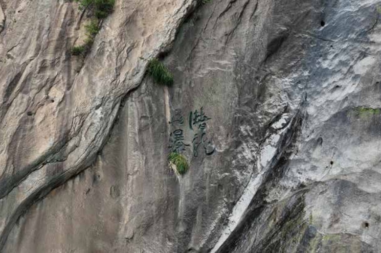 向东侧望去,同一作者所写的“鳌首金龟”四字气势恢宏,笔势如龙蛇腾跃,将神话意象与地质奇观结合,体现书法家对自然造化的诗性解读。来到崂山十二景之一的“龙潭喷雨”,您将看到玉龙般的飞瀑自高崖倾泻而下,水击深潭,声震幽谷,崖壁之上题刻遍布,与奔涌山泉相映成趣。在龙潭瀑下方崖壁上,1981年中国著名书法家沈鹏所题写的“潜龙飞瀑”四字笔势如瀑泻龙腾,“潜”字内敛蓄势,“飞”字纵逸张扬,突破传统章法束缚,体现“形式为内容服务”的现代书法理念。