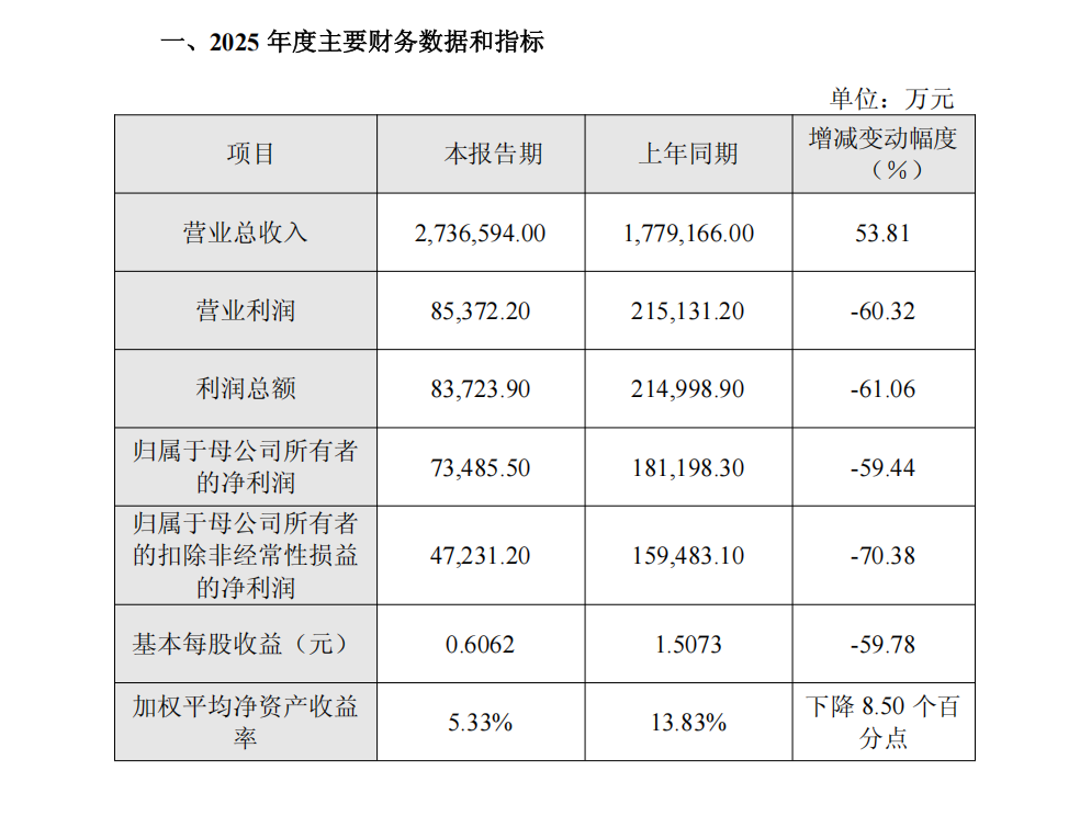 三一重能近日发布的2025年度业绩快报显示,报告期内,公司实现营业收入273.66亿元,同比增长53.81%;实现归属于母公司所有者的净利润7.35亿元,同比下降59.44%;实现归属于母公司所有者的扣除非经常性损益的净利润4.72亿元,同比下降70.38%。