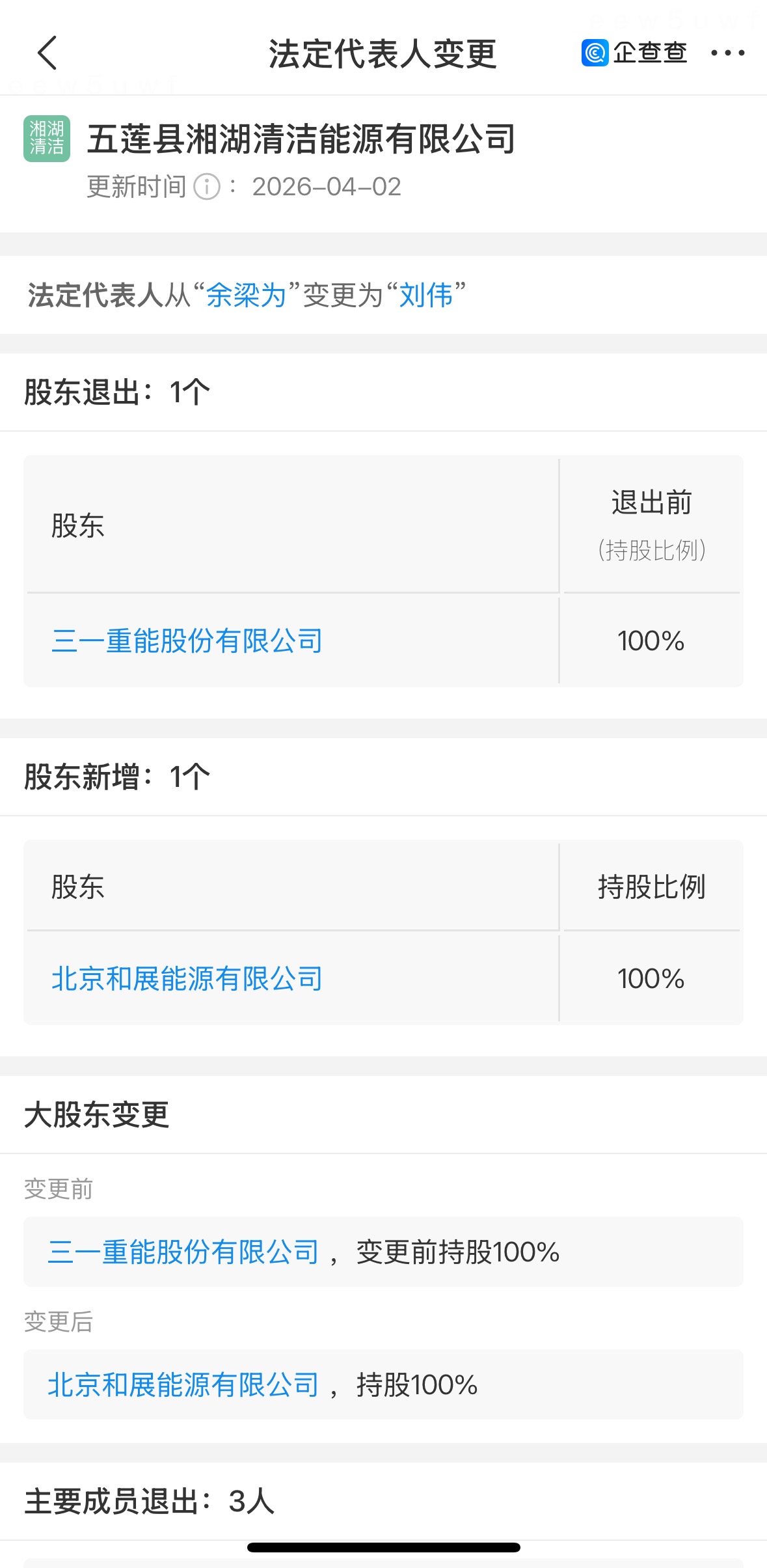 企查查App显示,五莲县湘湖清洁能源有限公司(下称“五莲湘湖清洁能源”)4月2日发生股东变更,原股东三一重能(688349.SH)接手该公司仅1个月就退出,新股东北京和展能源有限公司进入,双方持股均为100%。