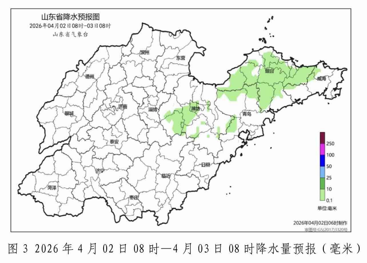 山东省气象台4月2日6时,发布过去24小时全省降水量预报以及未来三天天气预报。