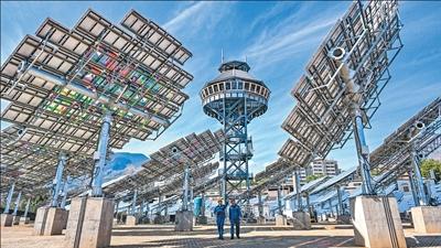 四川攀枝花市西区多面体钛酸锶聚光制氢(加氢)一体站中试基地,分布着144台定日镜,从不同方向将阳光反射到中央聚光反射塔上的24个制氢反应器里。经过聚光催化反应,水被分解成氢气和氧气,氢气经过冷却脱水被存储到加氢站的储罐里。攀枝花年均日照约2700小时,为光解水制氢提供了充足的太阳能。图为近日工作人员在基地里巡检多边形定日镜。(来源:人民日报;李向雨摄)
