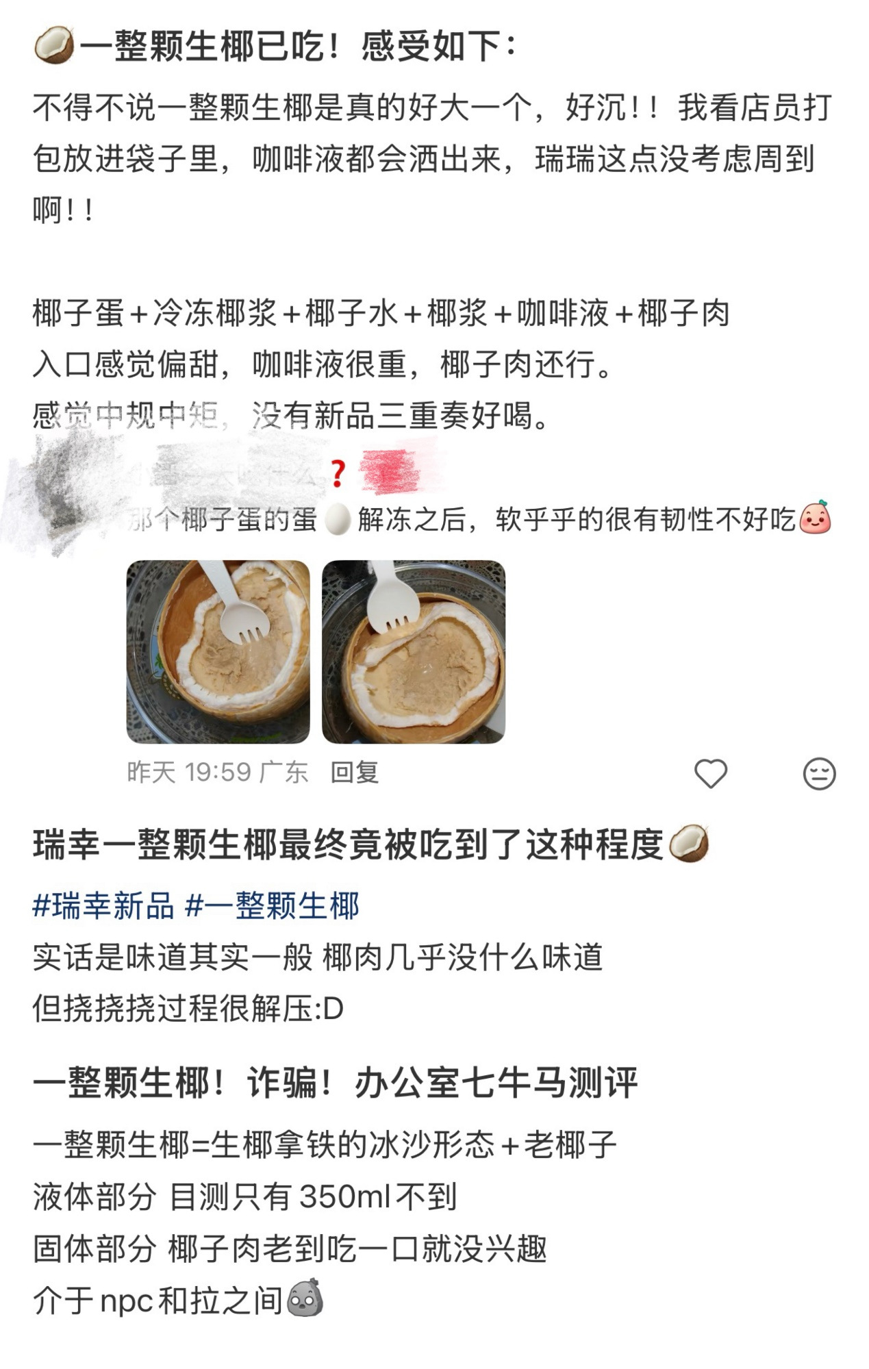 网友对于新品的评价也褒贬不一,咖啡液太少;不封口,一拿就漏;椰子蛋解冻后口感不好等等,瑞幸客服曾回应这款新品使用的椰子是冷冻品,超出保质期会禁止使用。