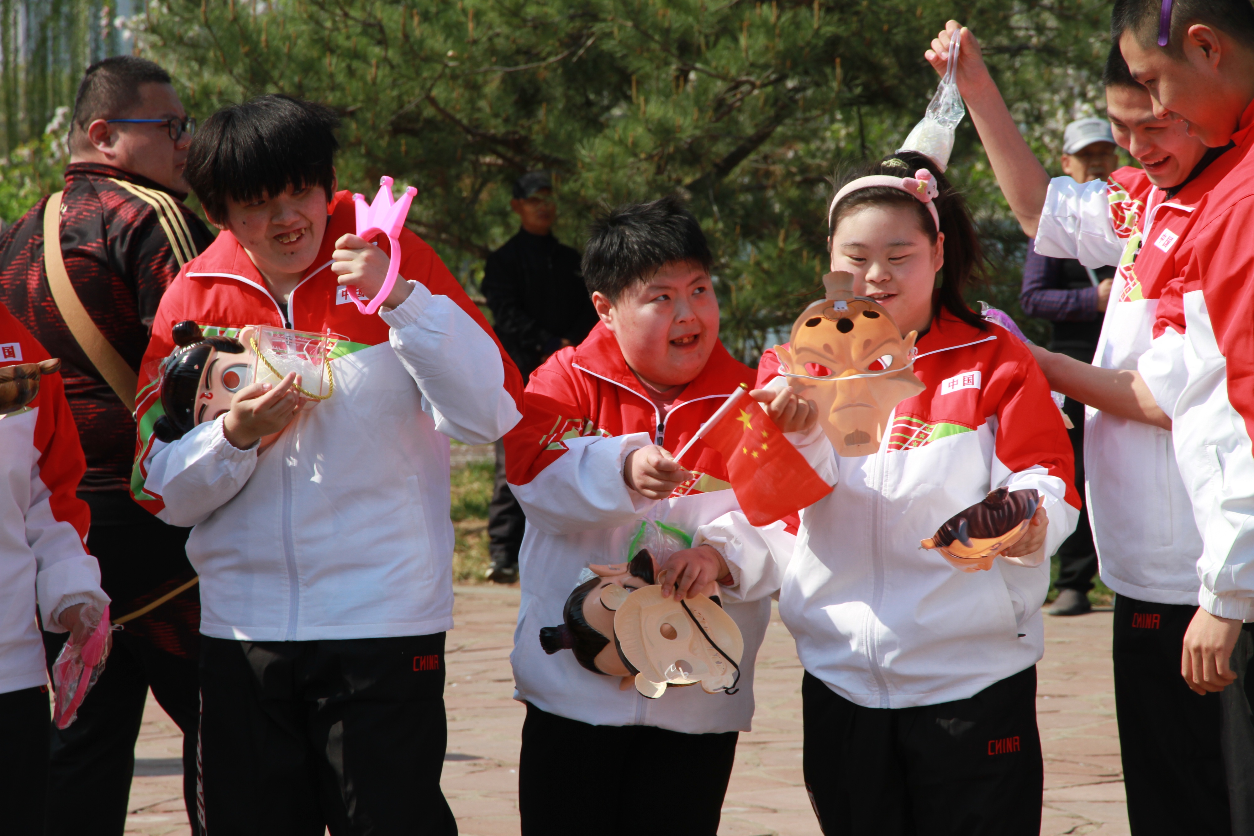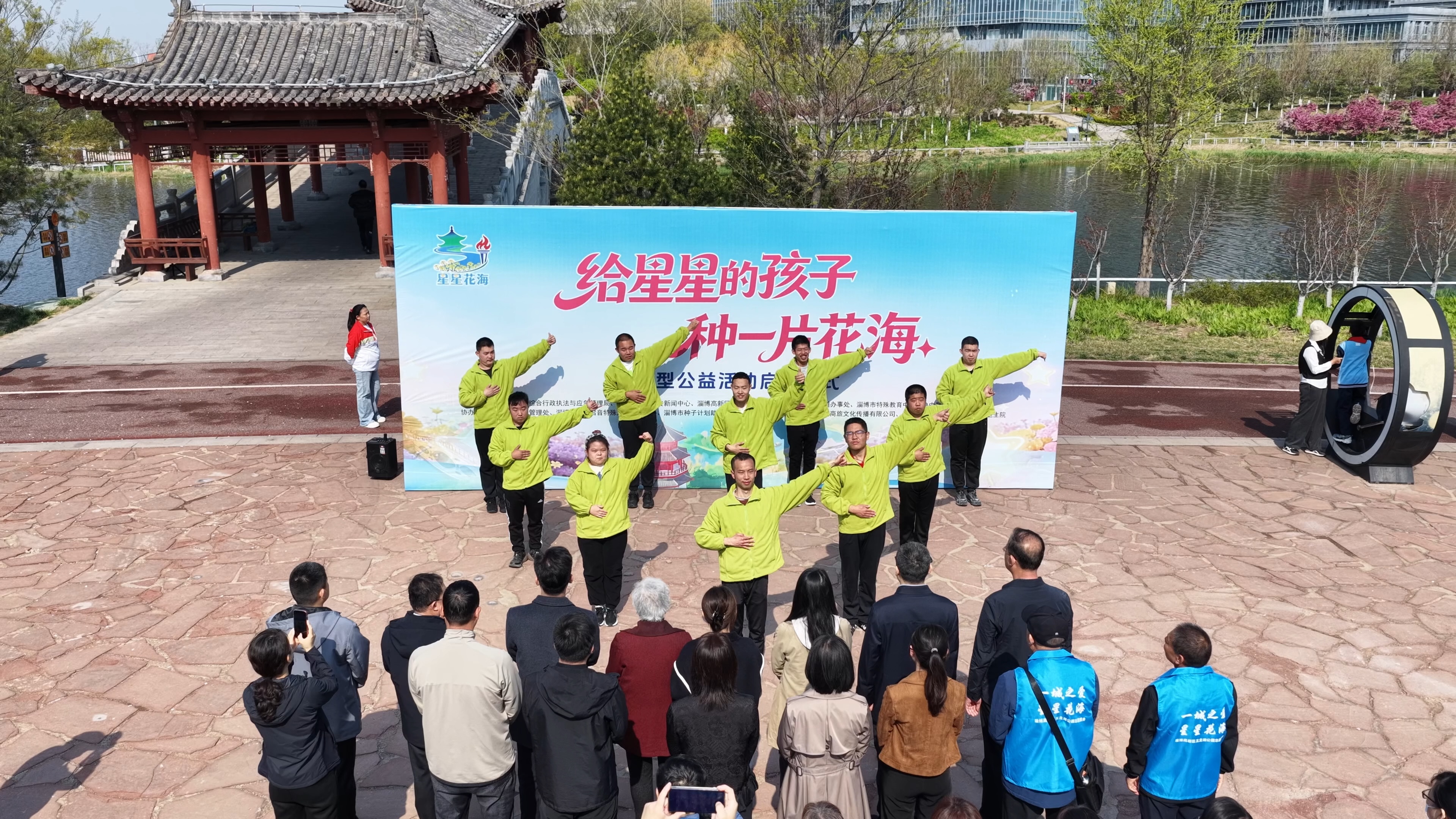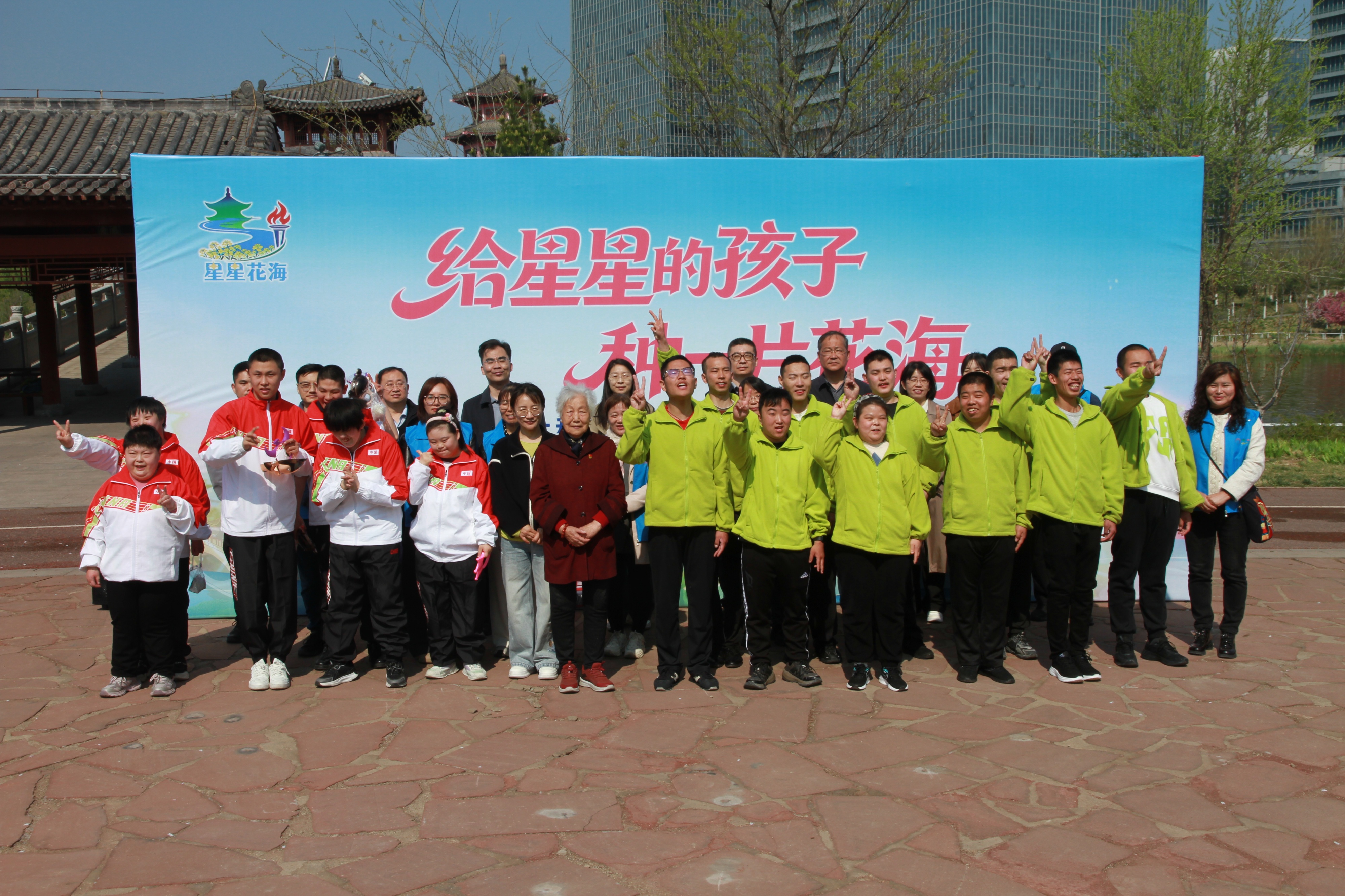 所有人聚集在背景板前。孩子、家长、志愿者、工作人员、穿着马甲的、戴着帽子的、系着蓝丝带的。有人比心,有人招手,有人抬头看镜头。