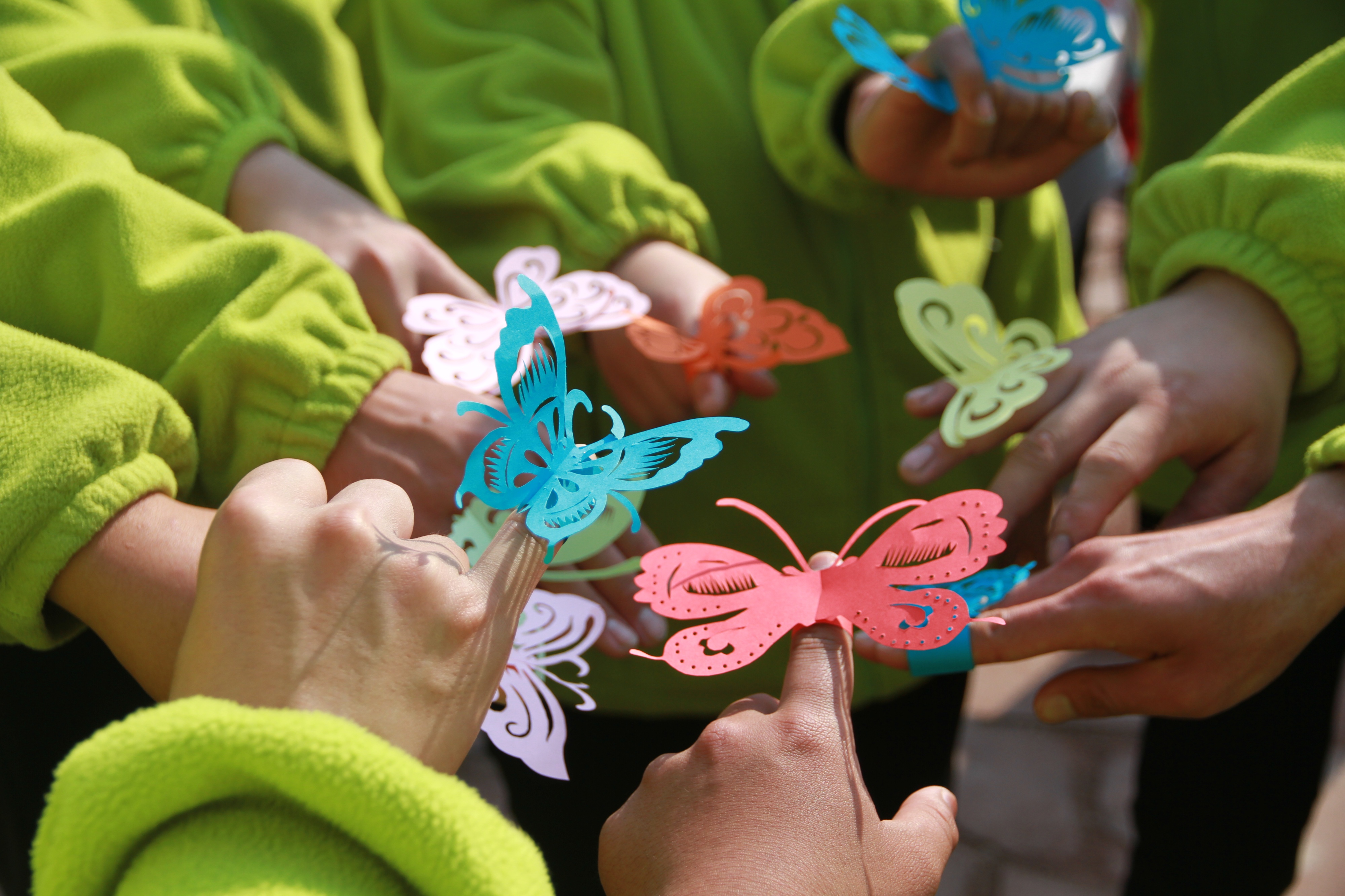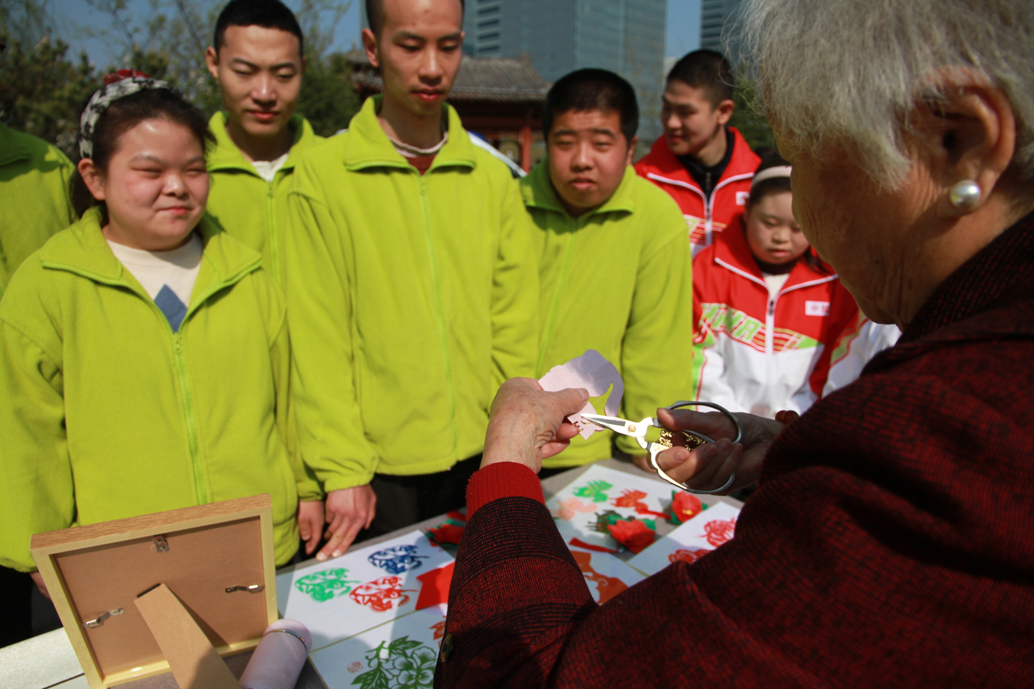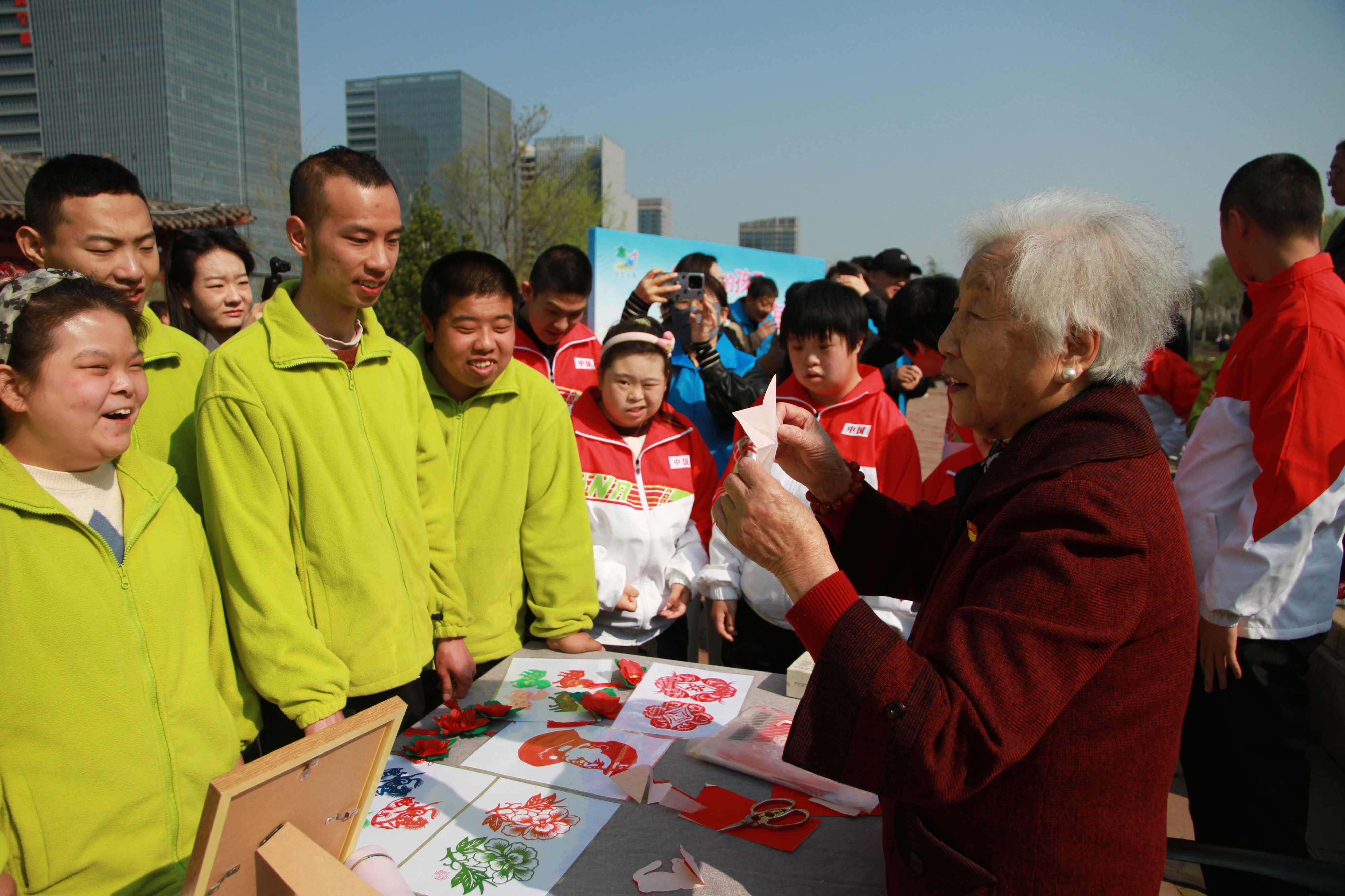 几个孤独症孩子围坐在她身边,有的盯着她手里的剪刀看,有的低头玩自己的手指。郝奶奶不着急,慢慢折,慢慢讲。