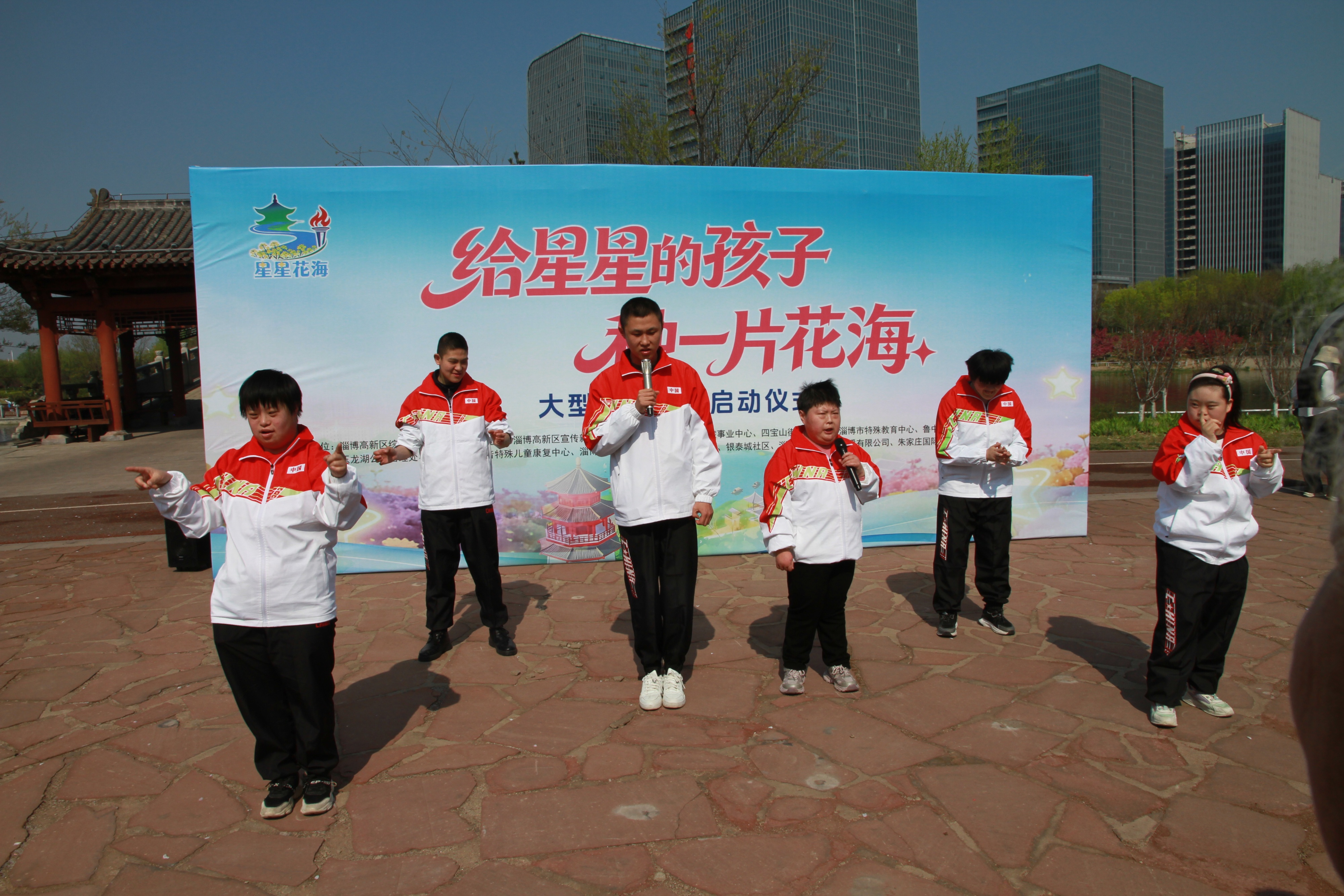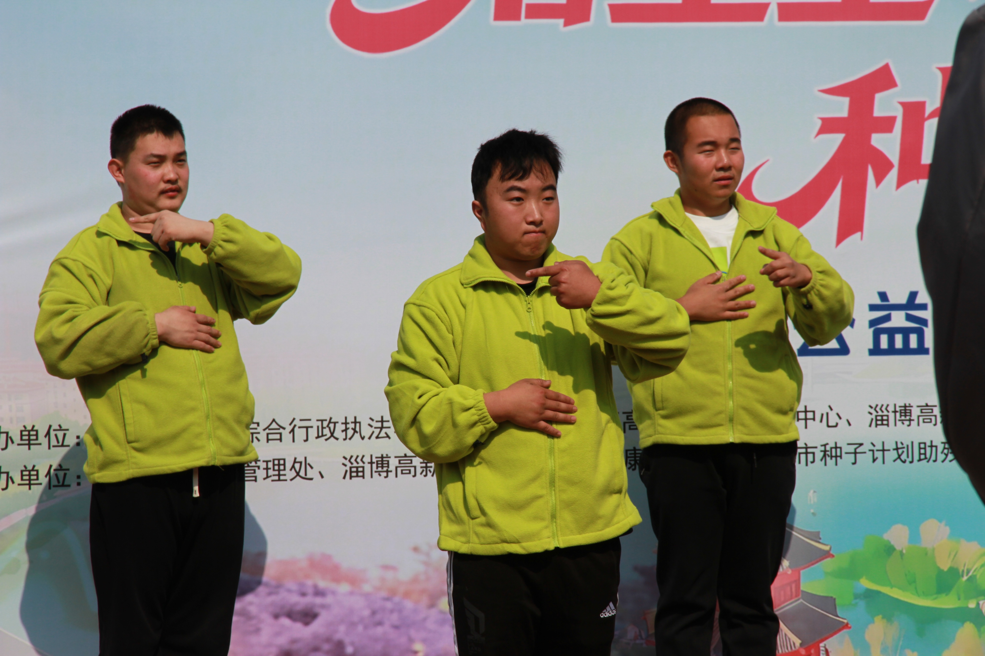 淄博高新区启音特殊儿童康复中心的孩子们上场了。10个孩子站成几排,穿着统一的服装,神情专注。音乐响起,他们齐刷刷地比划起手语,动作整齐划一,每一个手势都干净利落。