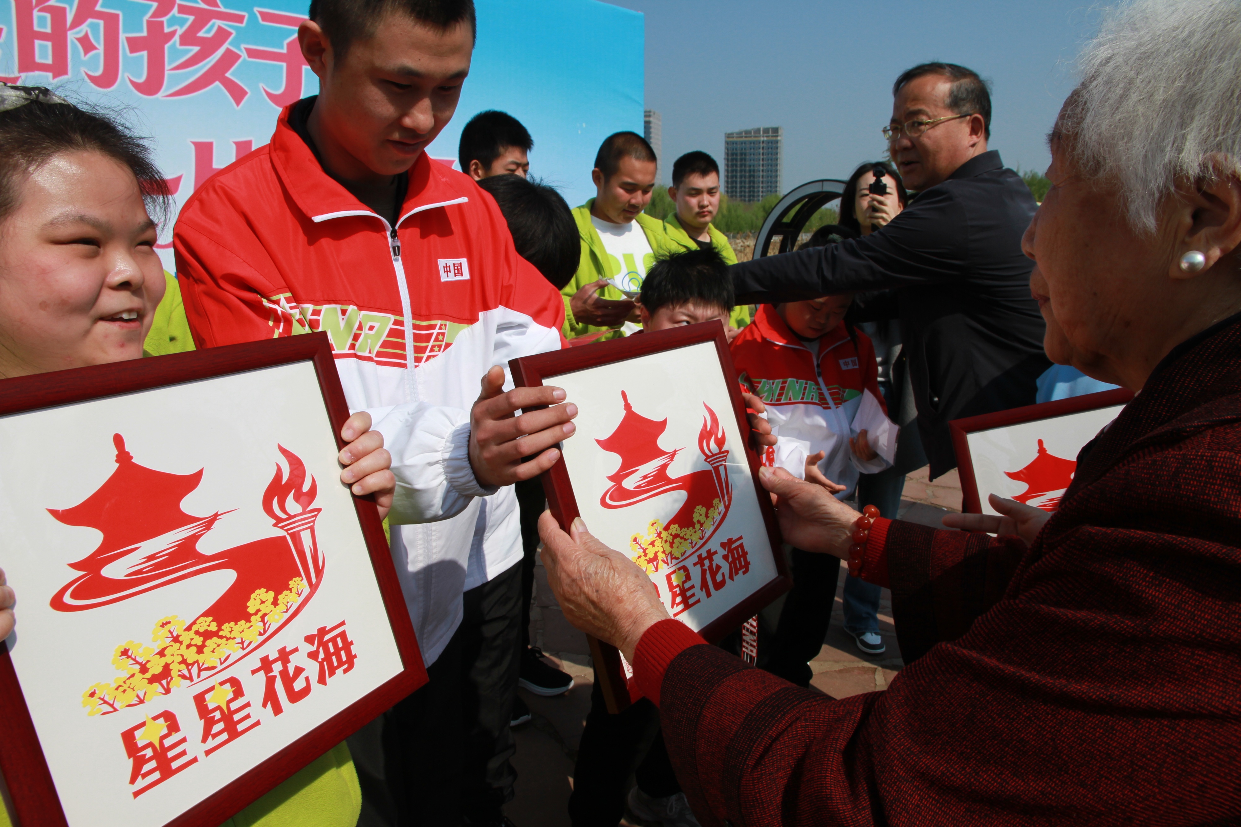 淄博高新区综合行政执法与应急管理局、四宝山街道办事处的领导走上台,和郝奶奶一起把剪纸作品送到每个孤独症家庭手里。红纸剪出的公益标志“星星花海”,被装裱在一个相框里。一个妈妈接过相框,凝视着,难掩激动的心情。