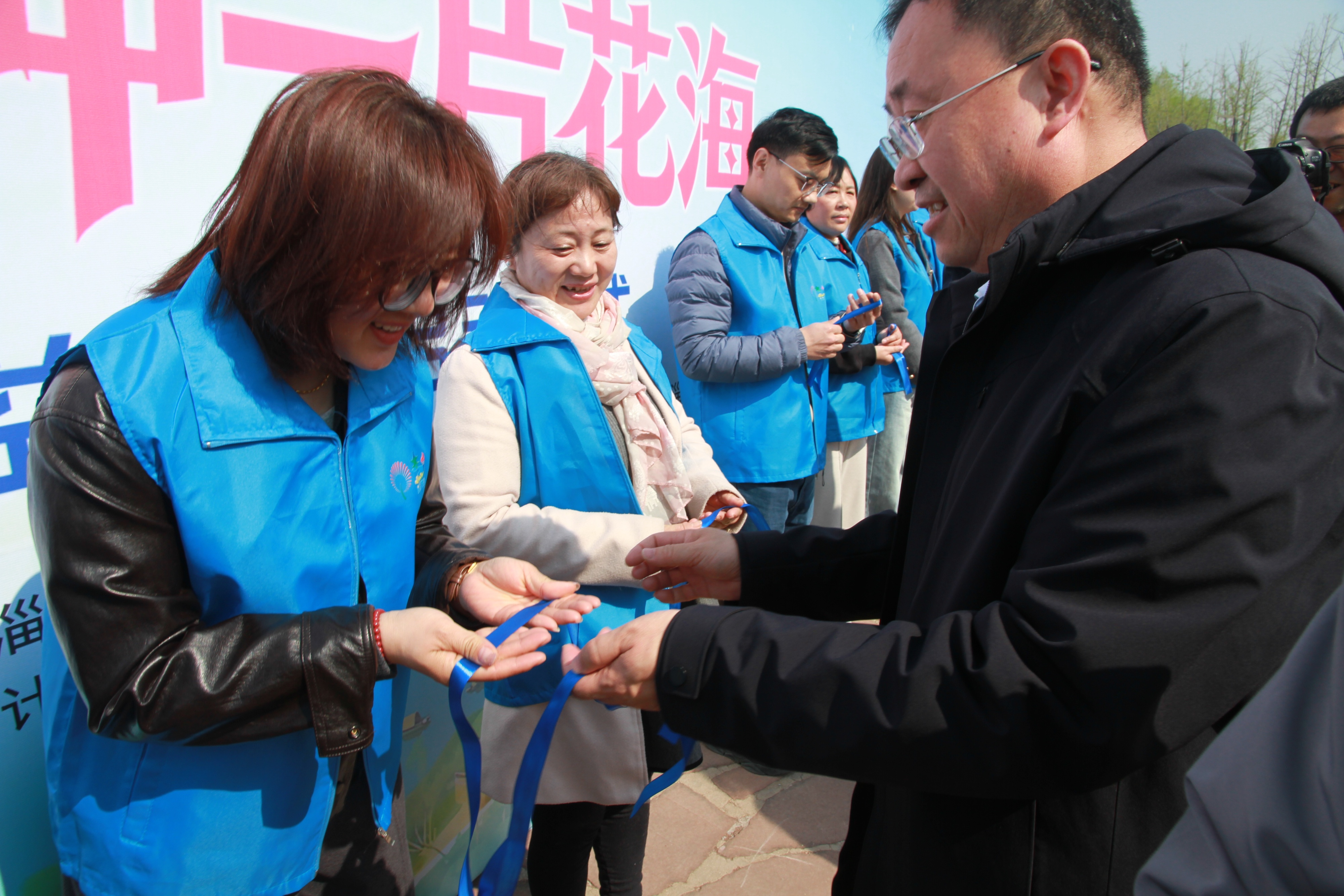 志愿者们排成一排。淄博高新区民政和文旅事业中心、淄博市特殊教育中心、鲁中晨报社的领导们把蓝丝带一一递到志愿者手中。蓝丝带在风里飘,像星星在眨眼。