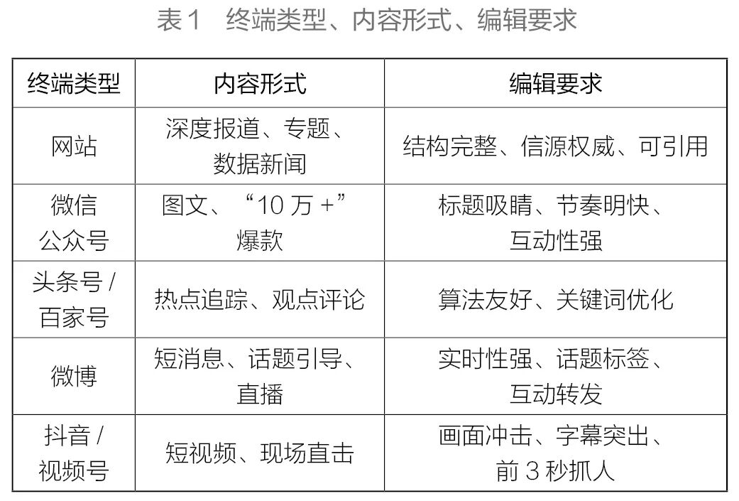 媒体融合不是“去制度化”,而是制度的重构与升级。我们制定了《“三审三校”制度实施细则》等制度,以确保内容安全与政治导向。同时,针对不同终端特性,建立“一次采集、多元生成、多端适配”的标准化流程(见表1)。