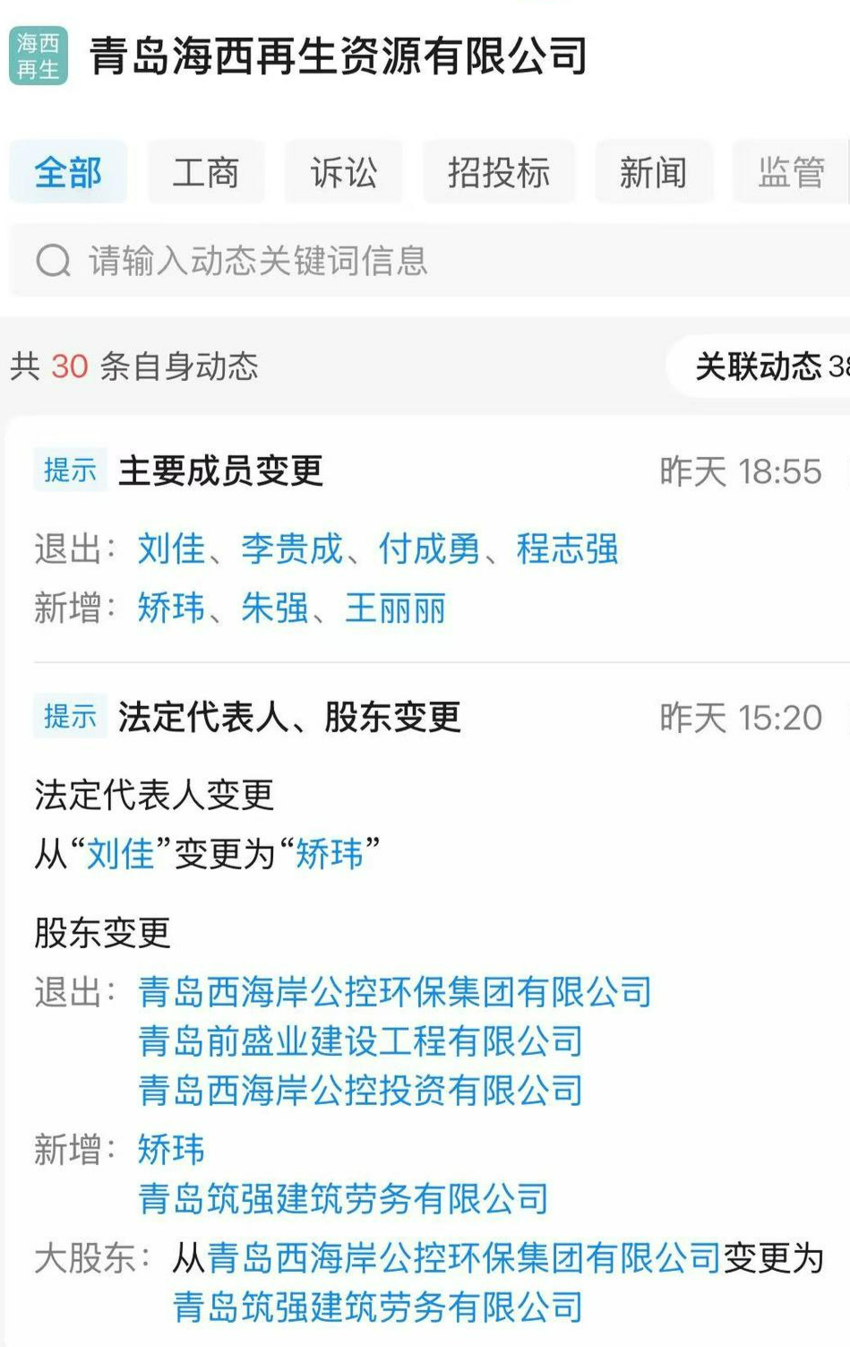 企查查信息显示,近日,青岛海西再生资源有限公司(下称“海西再生资源”)工商信息发生变更,公司股东结构与管理层团队全面调整。
