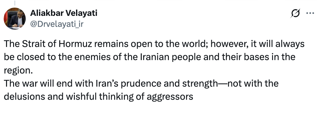 当地时间4月2日,伊朗最高领袖外事顾问、前外长韦拉亚提在其个人社交媒体平台账号上表示,霍尔木兹海峡对世界开放,但对伊朗人民的敌人及其在该地区的据点将永远关闭。韦拉亚提表示,冲突的结束取决于伊朗的决策和力量,而不是侵略者的妄想和傲慢。