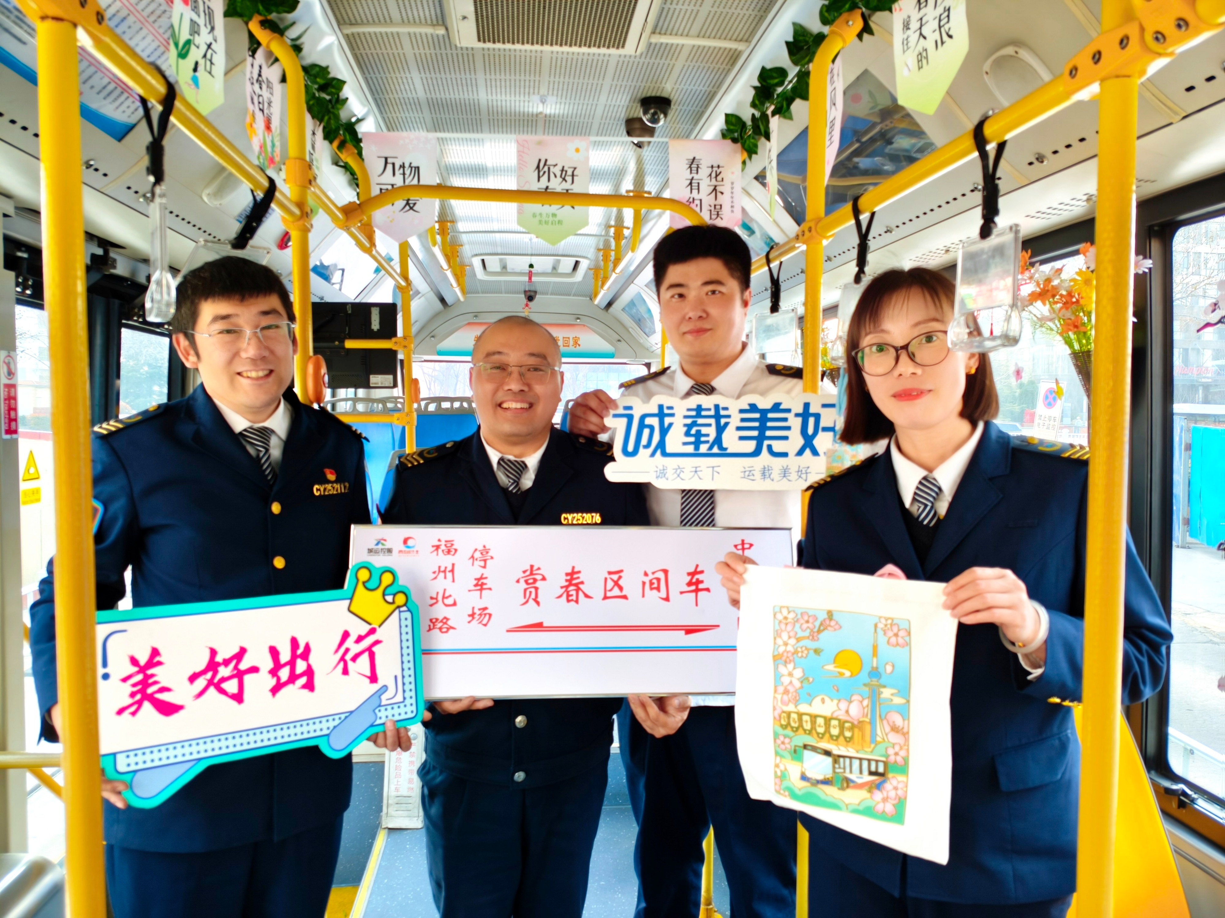 228路赏春区间充满春日巧思。市南巴士七分公司青年志愿者们精心挑选色彩鲜艳的鲜花贴纸及绿叶装饰,对车厢进行全方位布置。车窗上、扶手旁、车厢内壁,一朵朵仿真鲜花、一片片嫩绿枝叶错落点缀,将户外的春日生机搬进十米车厢,让乘客在乘车途中仿佛置身于春日画卷之中,感受春日暖意。