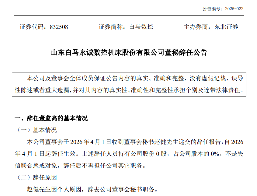 4月1日,山东白马永诚数控机床股份有限公司(832508.NQ,下称“白马数控”)公告称,董事会秘书赵健因个人原因辞去公司董事会秘书职务,辞任自4月1日起正式生效。辞任后,赵健不再担任公司任何职务。