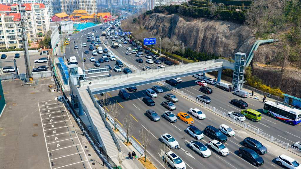 天桥主体采用钢箱梁结构,外立面以铝单板装饰,整体设计现代简约、兼具美观与耐用性。福州路沿线住宅小区密集,途经公交线路十余条,市民过街及公交换乘需求旺盛。天桥投用后,可有效实现人车分流,切实保障行人过街安全,大幅提升市民公交换乘效率与日常出行便利度。同时,天桥同步配套梯道与无障碍直梯,充分兼顾老年人、儿童及行动不便群体的通行需要。