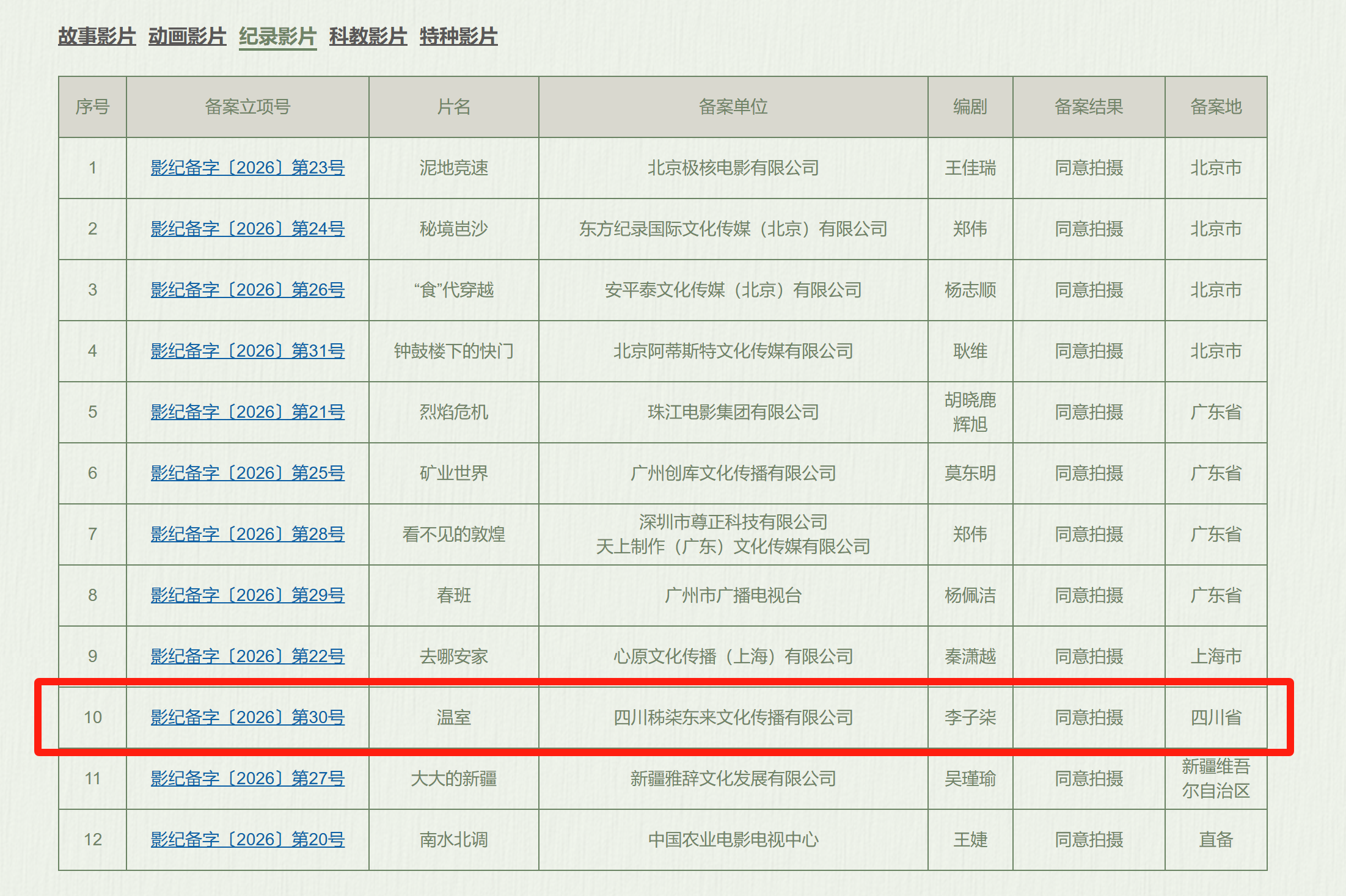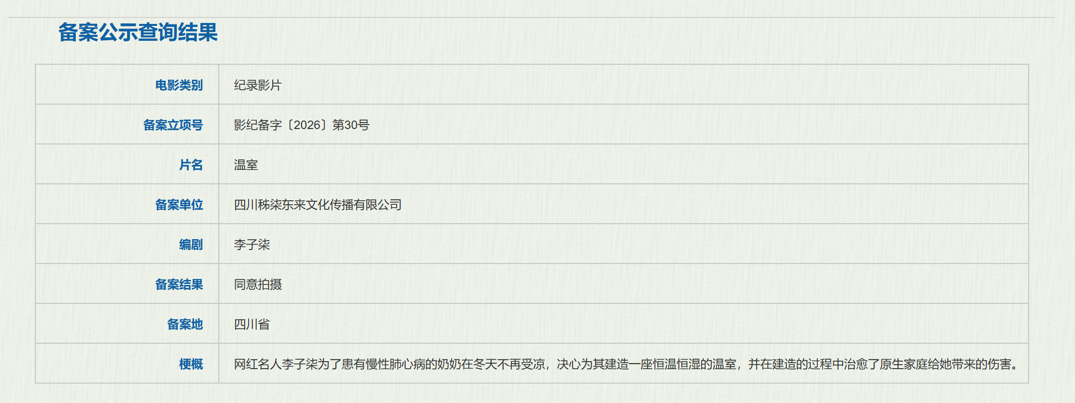 4月2日,记者从国家电影局官网获悉,由李子柒担任编剧的纪录片《温室》已正式通过备案,备案号为影纪备字〔2026〕第30号,备案单位为四川秭柒东来文化传播有限公司。