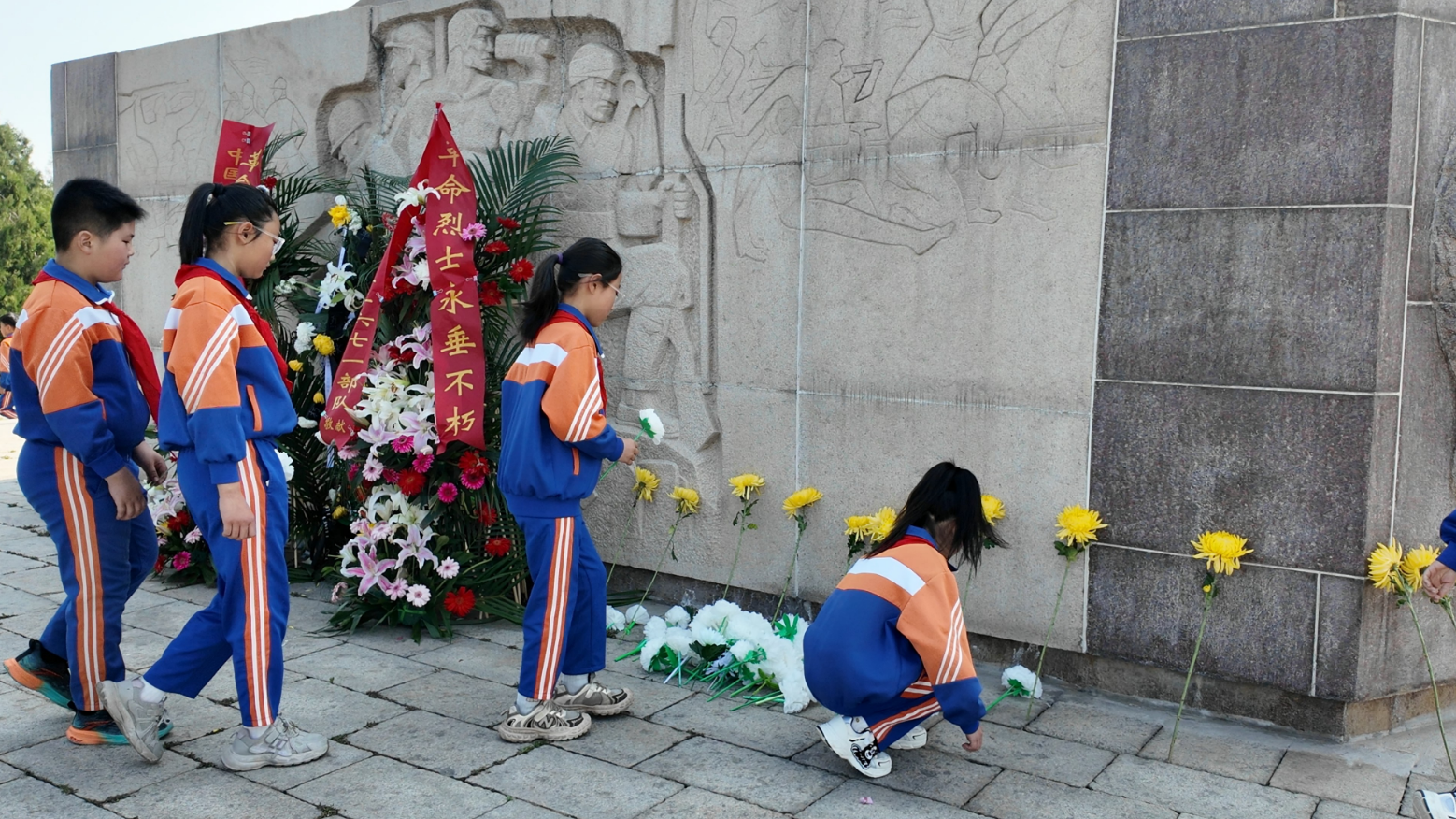 少先队员代表走上台前,用略显稚嫩却饱含深情的声音讲述英烈故事,不少同学眼眶泛红,静静地聆听着那段峥嵘岁月。“我是中国少年先锋队队员,我在队旗下宣誓……”全体少先队员举起右拳,重温入队誓词,铿锵誓言在陵园上空久久回荡。仪式最后,少先队员们排着整齐的队伍,手持亲手制作的小白花,缓缓走向烈士纪念碑。他们轻轻俯身,将白花敬献在碑前,有的孩子久久凝望着碑文,有的孩子深深鞠躬,将无限的哀思与敬意留在这片安息着英雄的土地上。